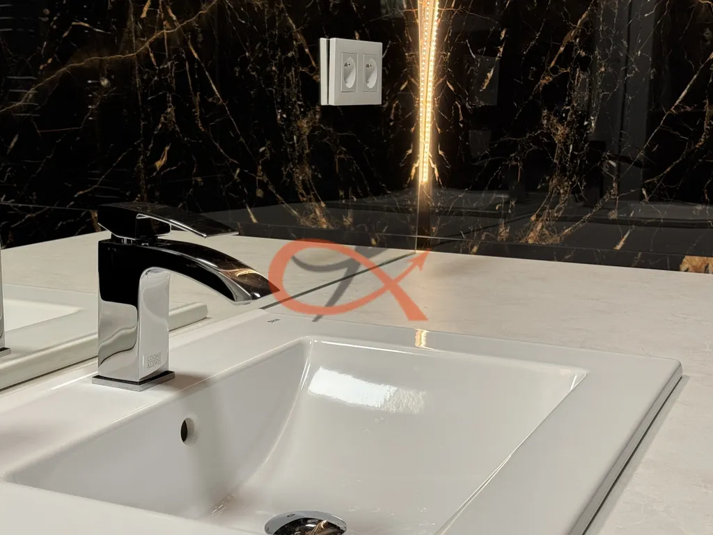 Koupelna zaujme svým elegantním provedením – walk-in sprchový kout, toaleta, designové LED zrcadlo, pračka se sušičkou a kvalitní sanitární vybavení v luxusním stylu. Praktické niche výklenky poskytují další úložné místo.