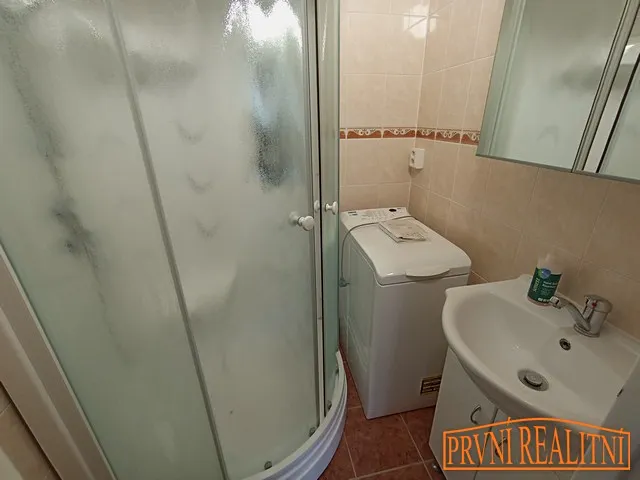 - v koupelně je umyvadlo, sprchový kout a pračka