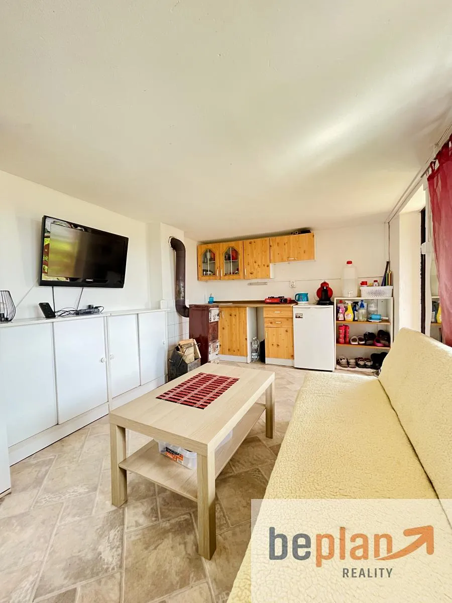 Chatka s výměrou 15m2 má dvě podlaží - na 1. NP se nachází technická místnost/dílna a další oddělený prostor, kde je v současné době umístěno chemické wc. Na 2.NP se pak nachází obývací místnost s kuchyňským koutem.
