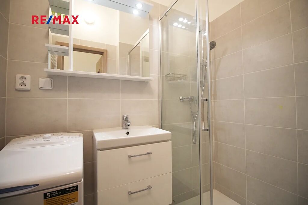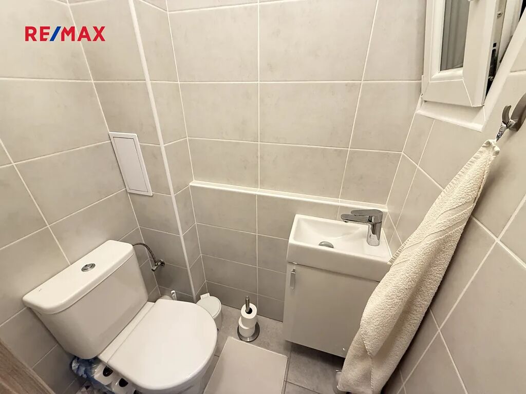 Dále je v bytě koupelna s velkým sprchovým koutem, toaleta je samostatná místnost s oknem a umývátkem.