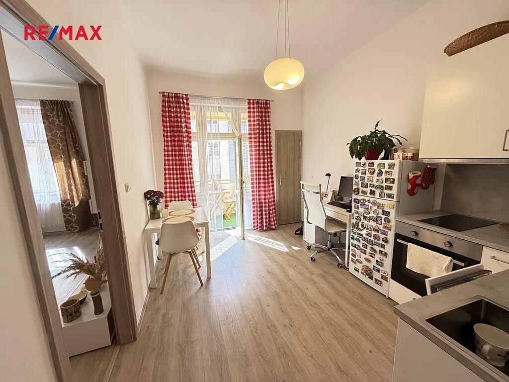 Dispozičně je byt řešen jako 2kk - kuchyně s balkonem 3m2, kde je místo pro příjemné posezení. Na balkon je vyvedena zásuvka i osvětlení, je zde šňůra na prádlo. Kuchyňská linka se sporákem, digestoří, troubou i myčkou na nádobí. U kuchyně je praktická komora/spíž s oknem a policovým systémem.