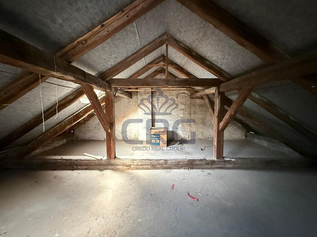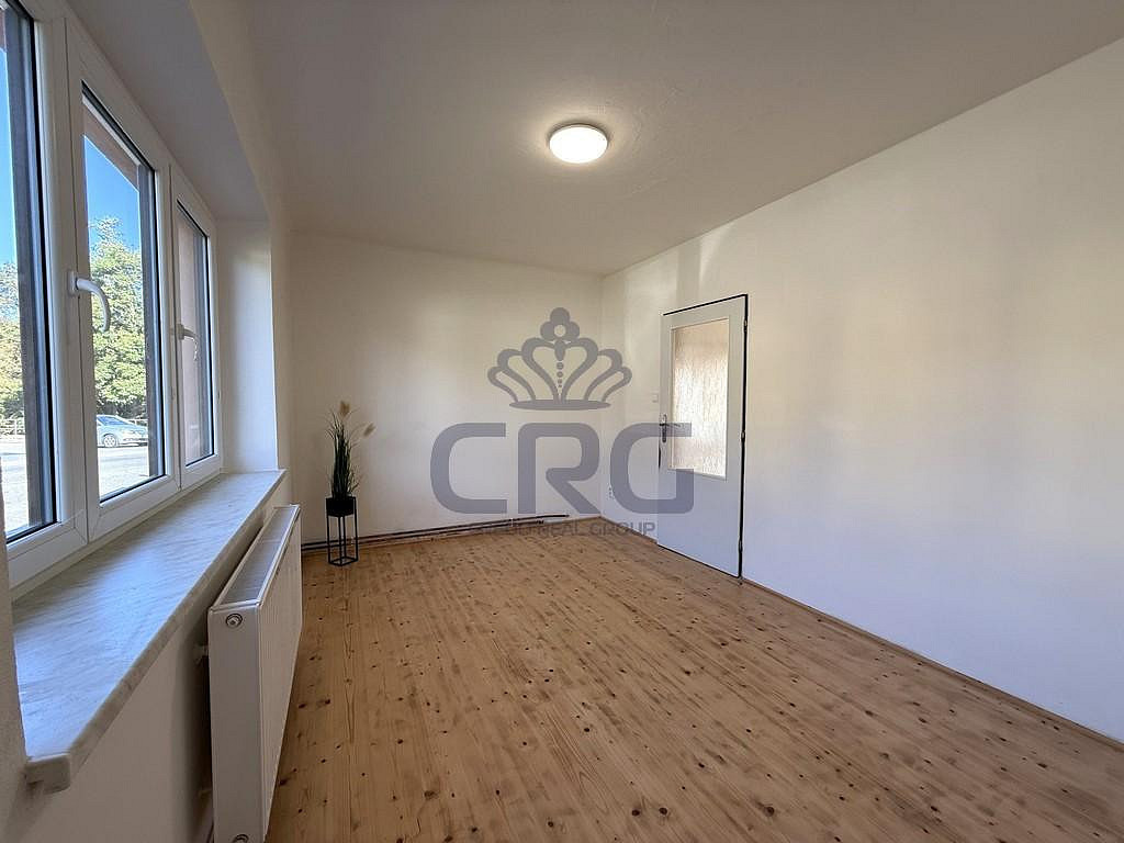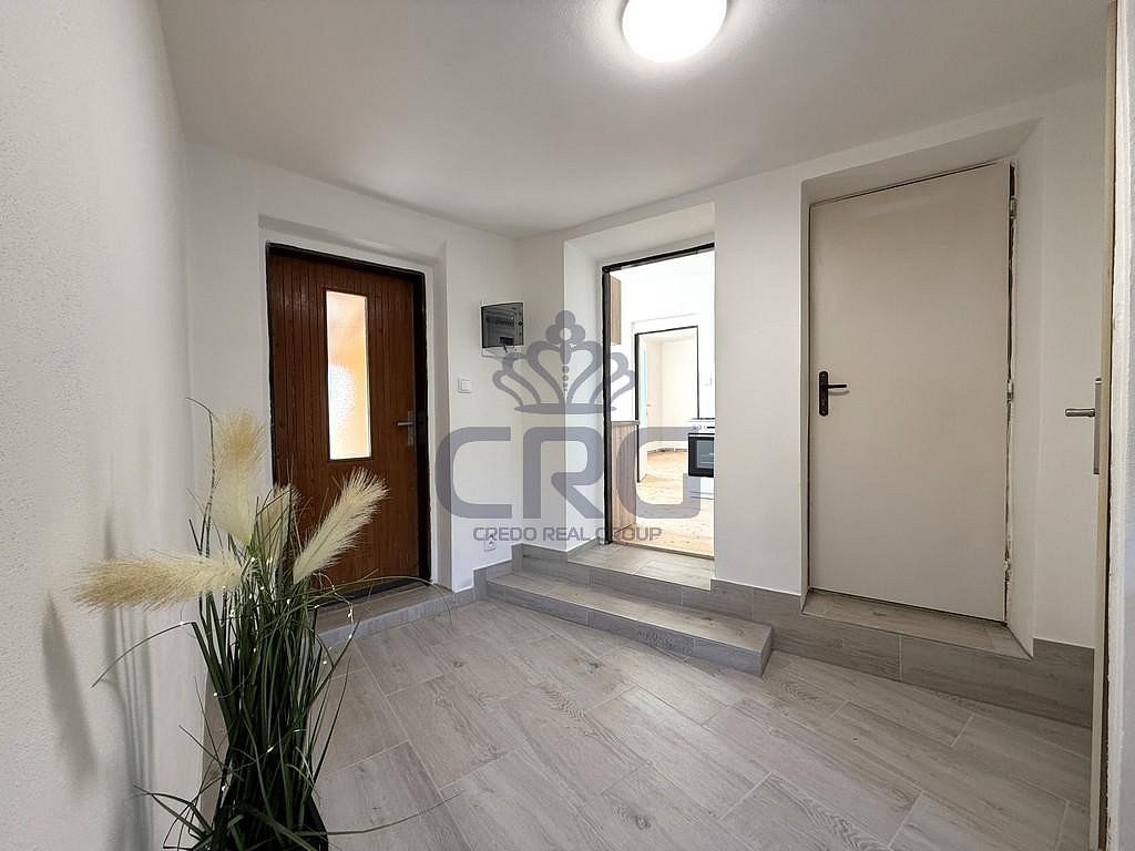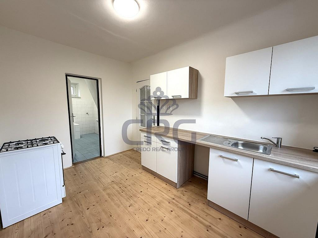 Do nemovitosti vedou dva vstupy. Jeden z hlavní ulice a druhý ze zahrady. Při vstupu do nemovitosti se ocitneme v prostorné předsíni o velikosti cca 11,15 m². Z předsíně plynule přijdeme do kuchyně o výměře cca 9,76 m², kde se nachází kuchyňská linka vybavená plynovým sporákem a troubou. Z kuchyně pokračujeme do pokoje o velikosti cca 16,05 m². Druhá místnost, která může sloužit jako ložnice má výměru cca 12,79 m². V domě je prostorná koupelna, která disponuje vanou, umyvadlem, topným žebříkem a přípojkou na pračku. V koupelně o výměře cca 7,21 m² je i plynový kotel, který zajišťuje vytápění celého domu. WC je samostatné o výměře cca 1,35 m². Nájemce může využívat i půdní prostor, který se nachází nad jednotkou a je přístupný z předsíně.