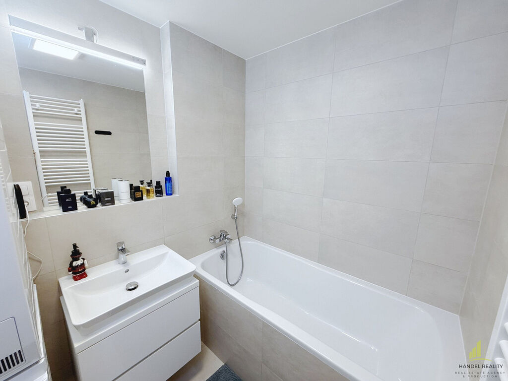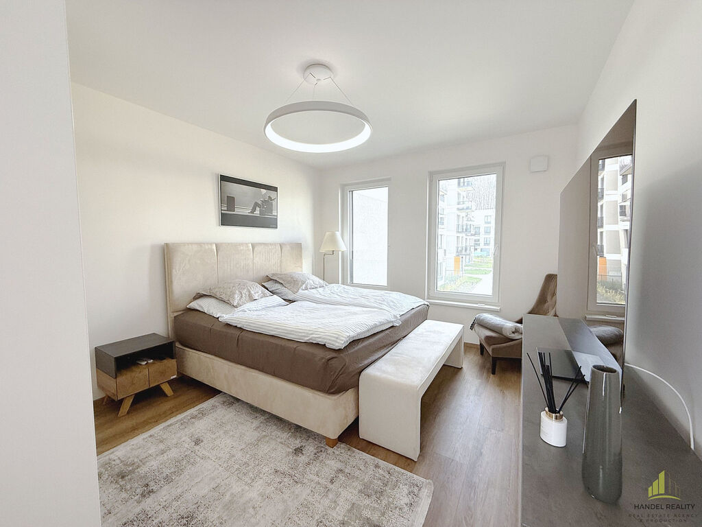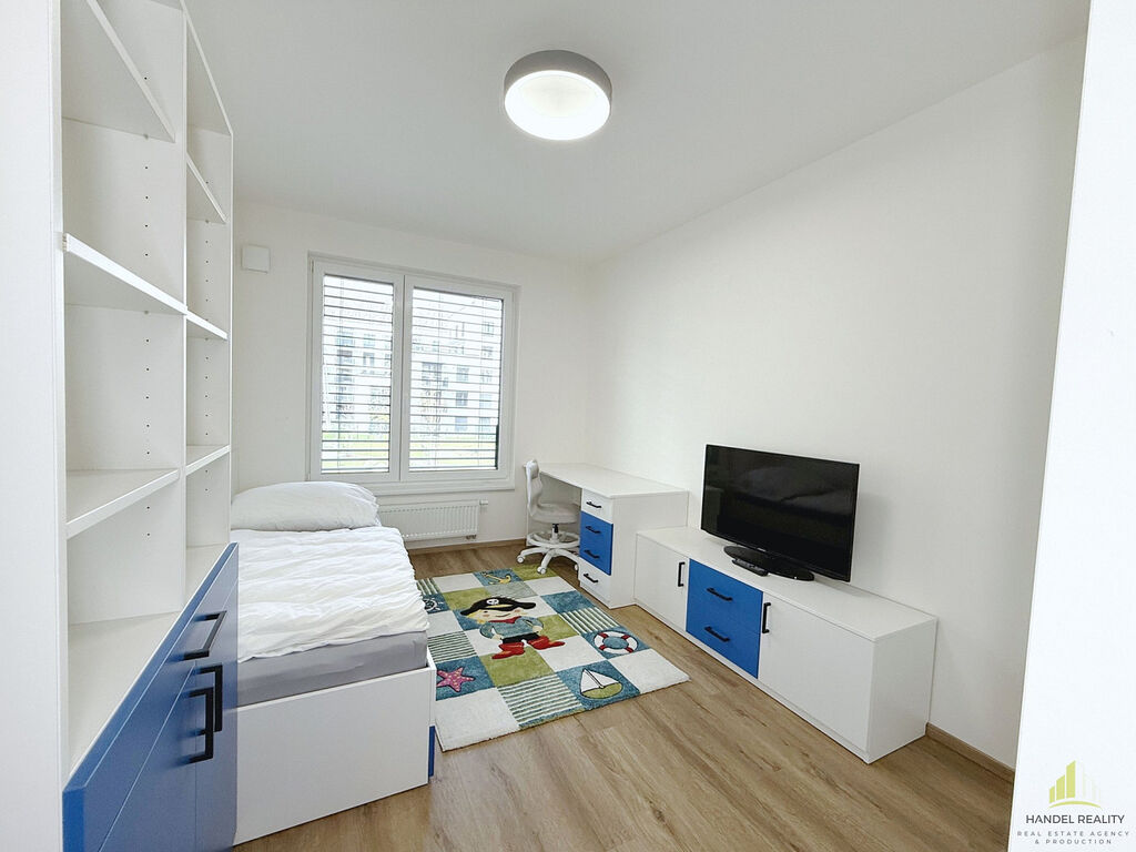 Dispozice 3+kk zahrnuje prostorný a prosvětlený obývací pokoj s přístupem na balkon s nádherným výhledem do zeleně. Dominantou obývacího prostoru je luxusní polohovatelná sedací souprava, která zajišťuje maximální pohodlí. Součástí je plně vybavený kuchyňský kout s moderními spotřebiči. Ložnice i dětský pokoj jsou orientovány do tichého vnitrobloku, kde se přímo pod okny nachází soukromé dětské hřiště – ideální pro rodinu s malým dítětem.