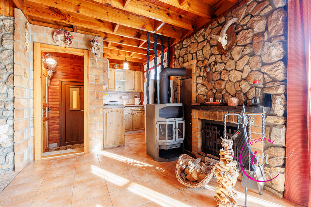 Použité materiály dokonale ladily se zdejší přírodou. Ať už dřevo, nebo dominantní kamenný komín, jako by sem odnepaměti patřily.