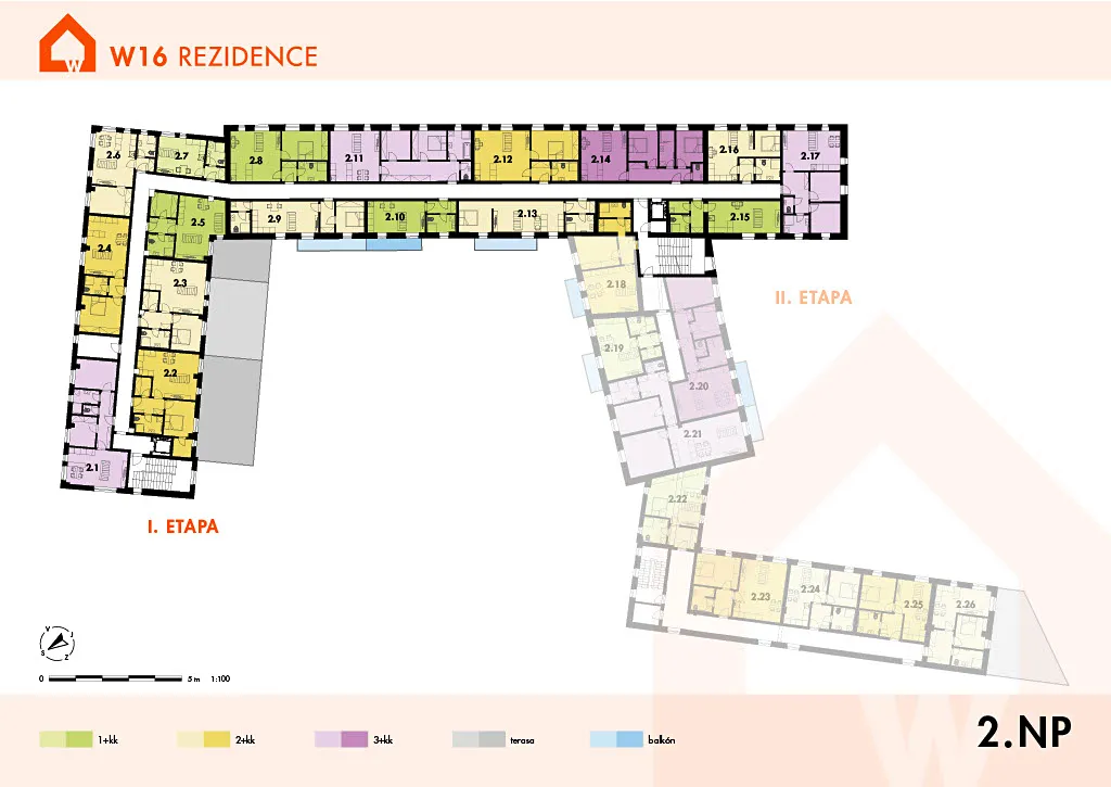 Byt č. W.2.5 se nachází ve 2. nadzemním podlaží budovy A, orientované do vnitrobloku. Součástí bytu je také sklep o velikosti 1,97 m².