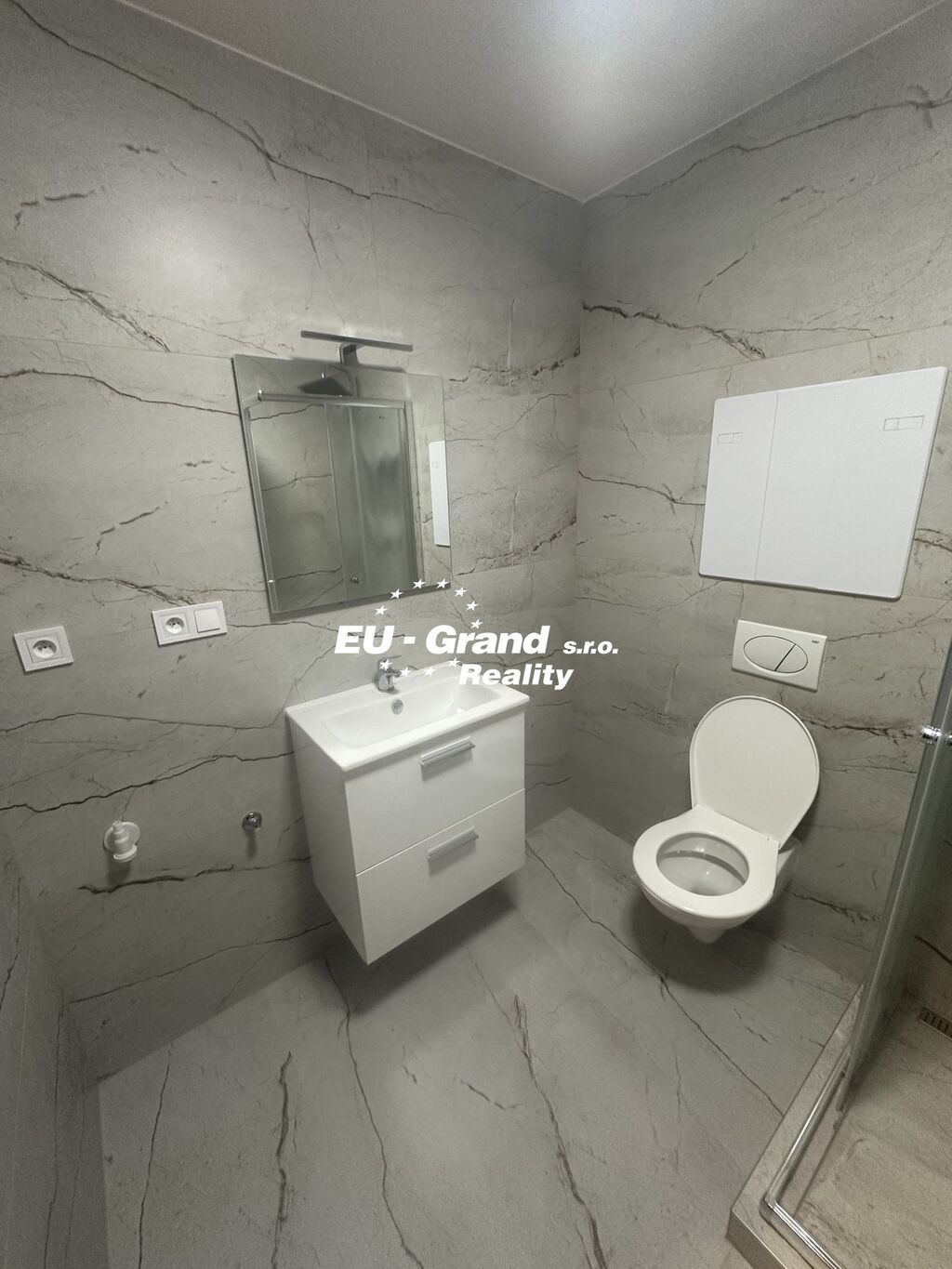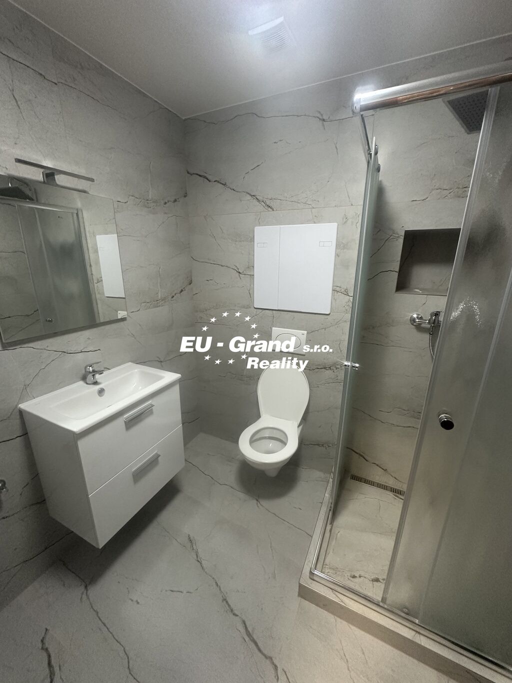 Koupelna je společná s WC. Je vybavená umyvadlem, sprchovým koutem a dostatečným prostorem pro umístění pračky.