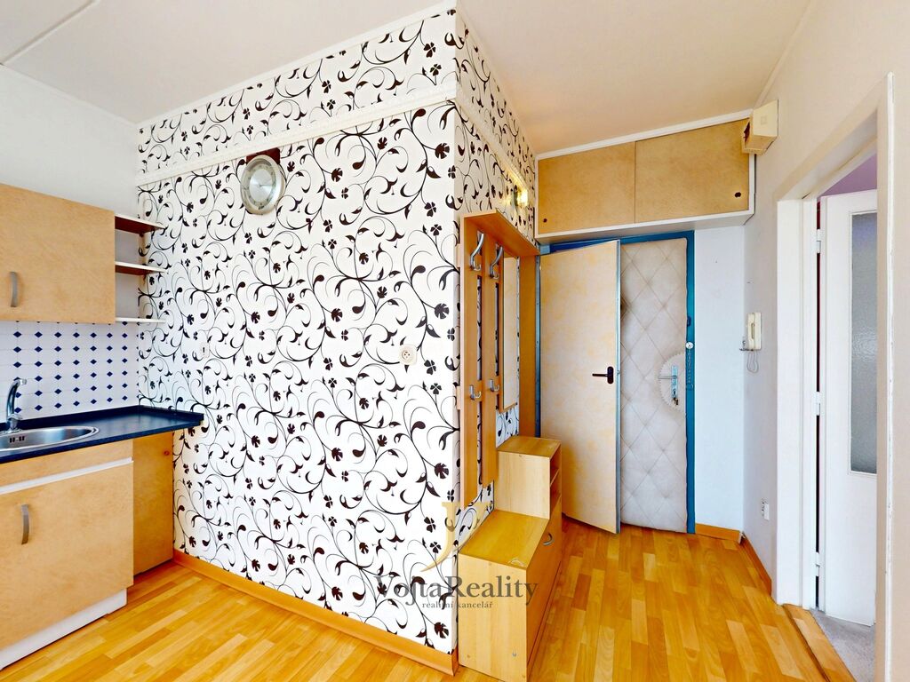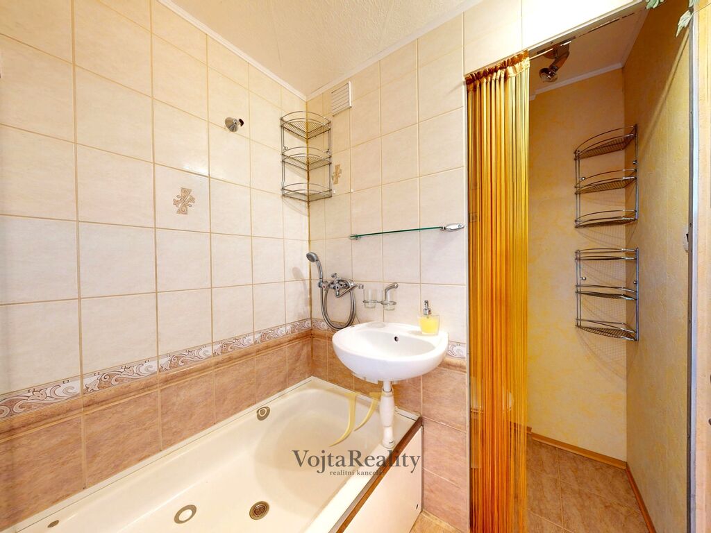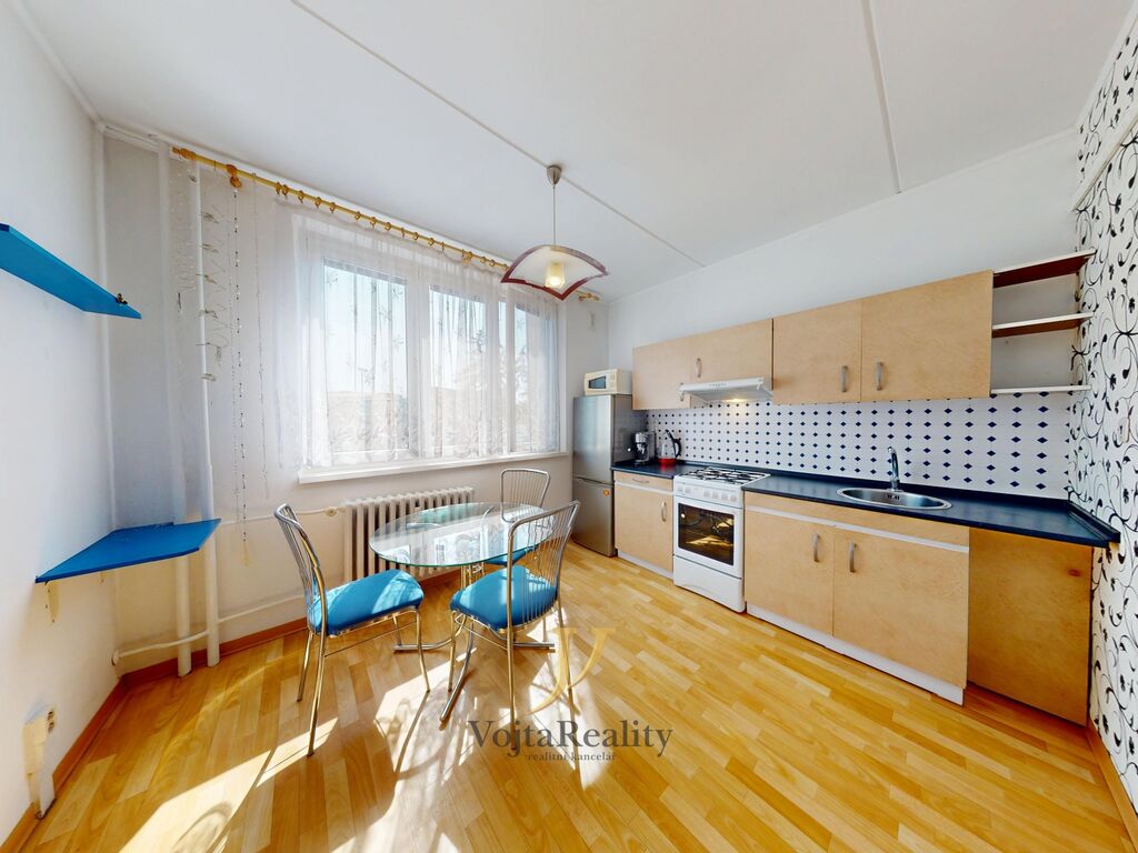 Kuchyň je vybavena vším potřebným – kuchyňská linka, plynový sporák s troubou, lednice s mrazákem, mikrovlnná trouba, varná konvice a pračka. V obytné části najdete postel, křeslo, další nábytek a televizi. Nechybí ani vestavěné skříně a police, takže o úložný prostor nebude nouze. Příjemné posezení poskytuje jižně orientovaná lodžie s výhledem do zeleně. K bytu náleží také sklepní kóje. Plastová okna s dvojskly, vinylové podlahy a dlažba v koupelně podtrhují celkový komfort.