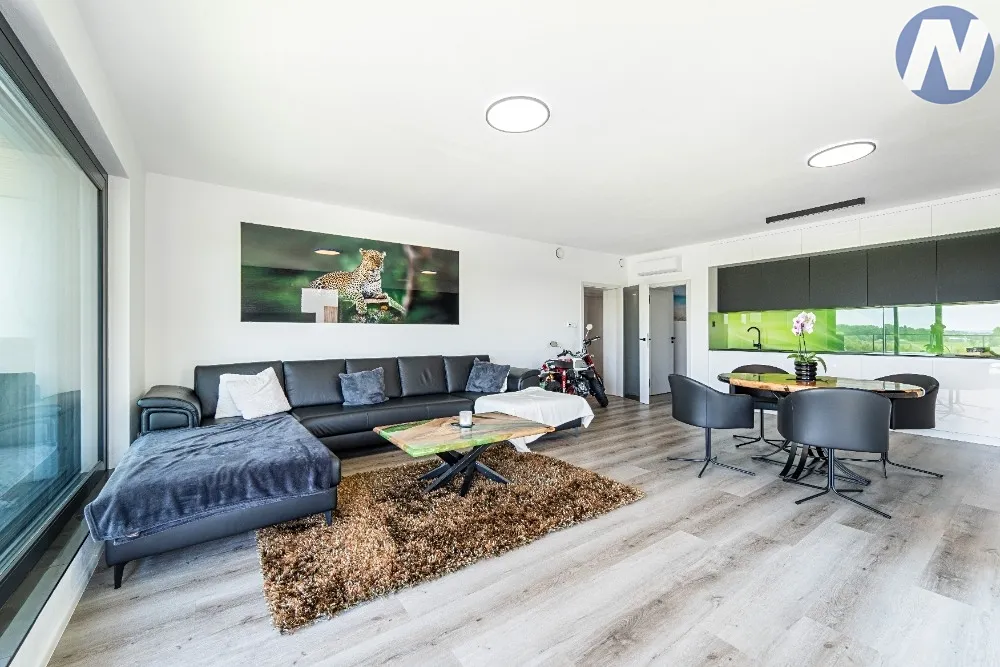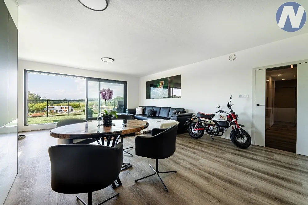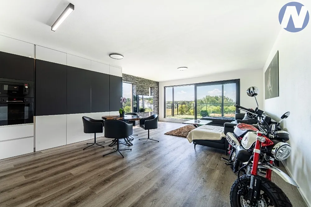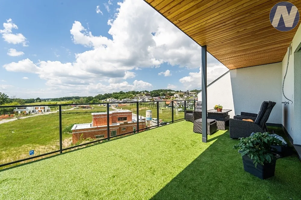Tento byt je dispozičně řešen jako bezbariérové 3+kk, propojené portálovými okny s velmi prostornou terasou (JZ orientace) s úžasným panoramatickým výhledem do okolí. Celý byt působí velmi vzdušným a prostorným dojmem.