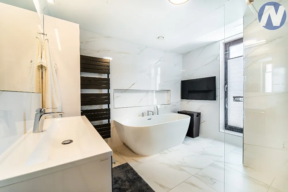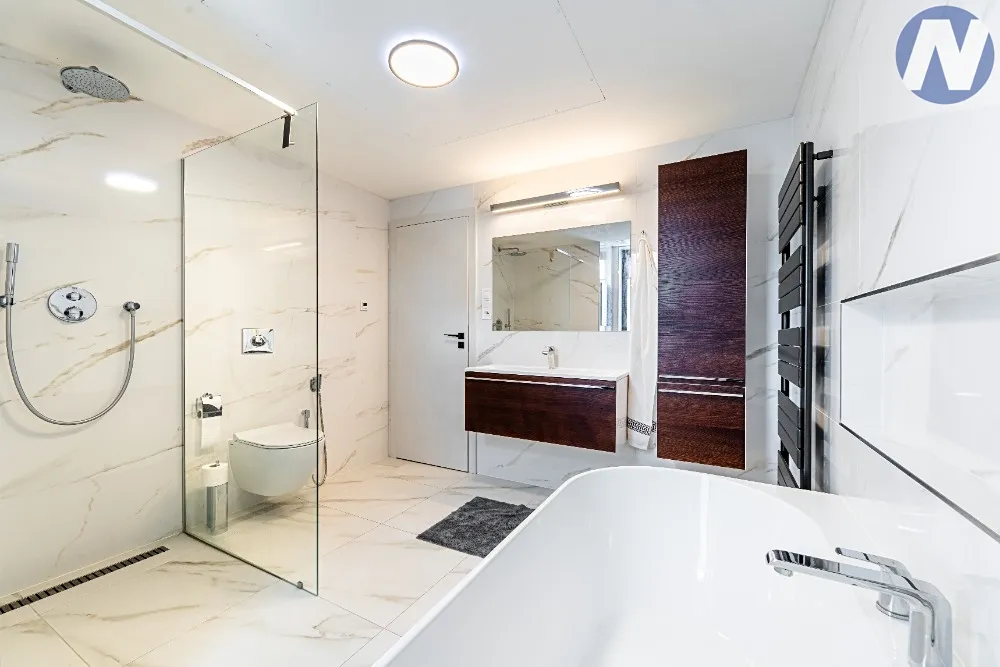 V celém bytě je podlahové topení, klimatizace i rekuperace, designová koupelna je vybavena vanou i sprchovým koutem, nová kuchyň nabízí vše co od ní můžete očekávat. Dům je vybaven výtahem.