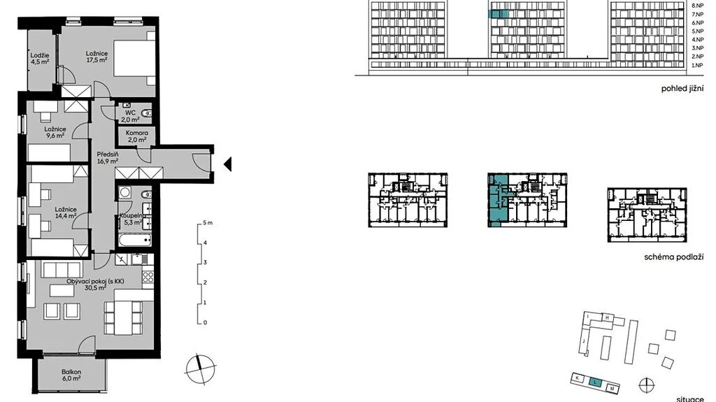 • Ložnice: 17,5 m² s lodžií 4,5 m2