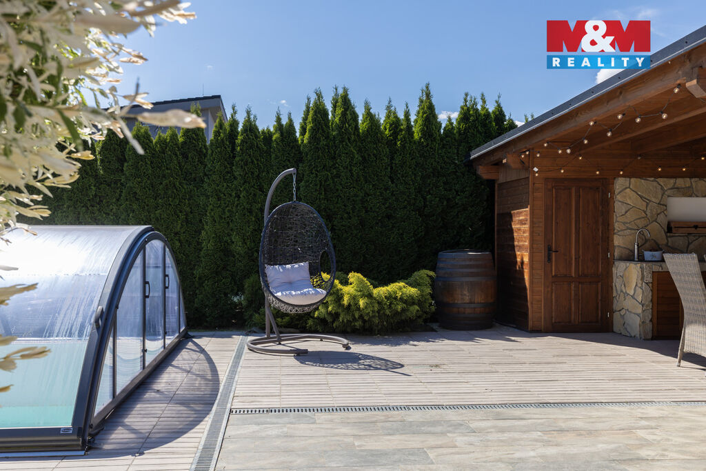 Exkluzivní nabídka: Moderní bungalov 5+KK v Jistebníku Nabízíme k prodeji samostatně stojící cihlový bungalov 5+KK o užitné ploše 172 m² na pozemku 1050 m² v klidné, lukrativní lokalitě obce Jistebník. Tento dům je ideální volbou pro náročné rodinné bydlení. Dispozice: prostorný obývací pokoj s novou kuchyní, 4 komfortní pokoje, koupelna s vanou, sprchovým koutem a WC, samostatné WC, technická místnost, vstup na venkovní terasu. Exteriér: nová fasáda kombinovaná se žulovými prvky, luxusní venkovní kuchyně z pískovce se sporákem, grilem, udírnou a pecí na pizzu, venkovní stání pro dvě auta, zastřešený bazén s mořskou vodou, elektrické venkovní žaluzie na domě. Technické vybavení: tepelné čerpadlo, krb, klimatizace, bazén 8x4 m. Energetická třída: B - velmi úsporná. Tento dům poskytuje pohodlné a moderní bydlení v prestižní lokalitě, ideální pro rodiny. Pro více informací nebo domluvení prohlídky nás prosím kontaktujte.