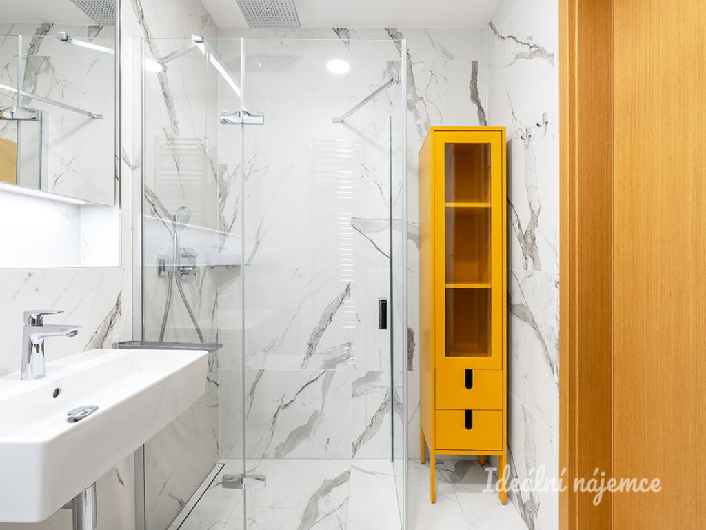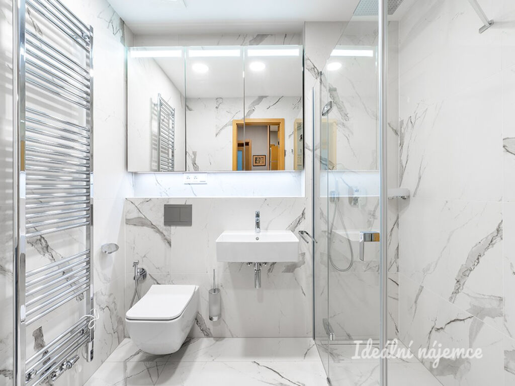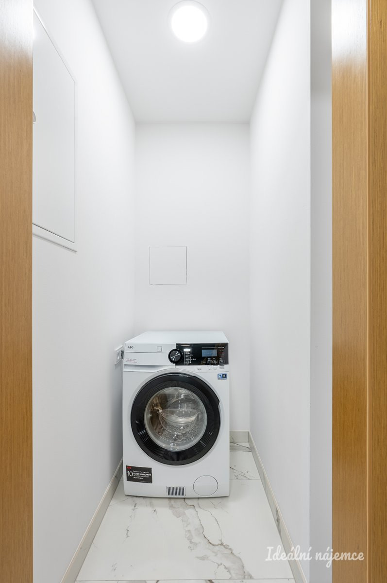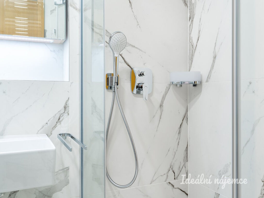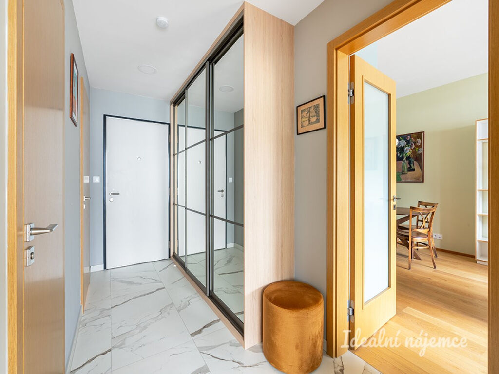Z haly vybavené prostornou vestavěnou skříní je vstup do vkusně zařízené koupelny se sprchovým koutem a závěsnou toaletou a samostatné komory s pračkou.