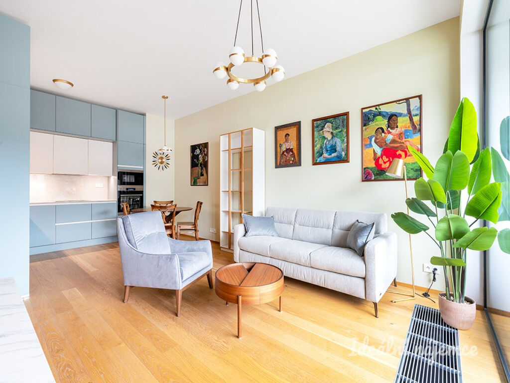 Bytu o rozloze 58 m2 dominuje nádherně zařízený reprezentativní obývací pokoj (25 m2) s nadstandardní kuchyňskou linkou plně vybavenou kvalitními vestavěnými spotřebiči s množstvím úložných prostor. Z obývacího pokoje je přístup na balkón s posezením.