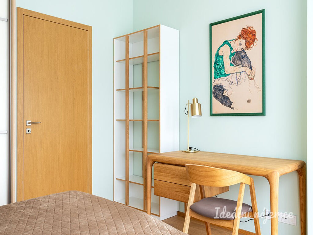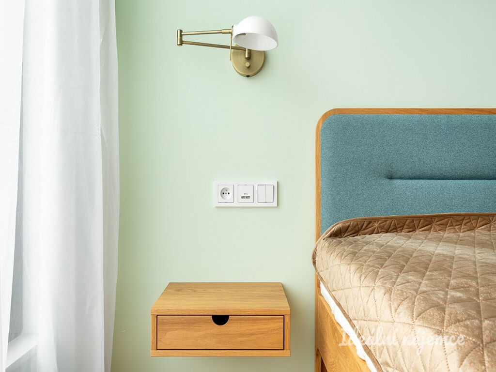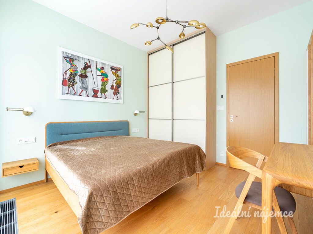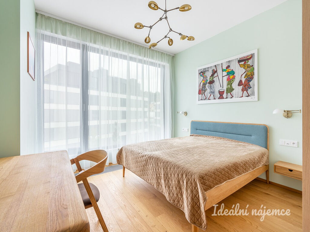 Prosvětlená ložnice (15 m2) je vybavena pohodlnou postelí, prostornou vestavěnou šatní skříní a množstvím promyšlených detailů.