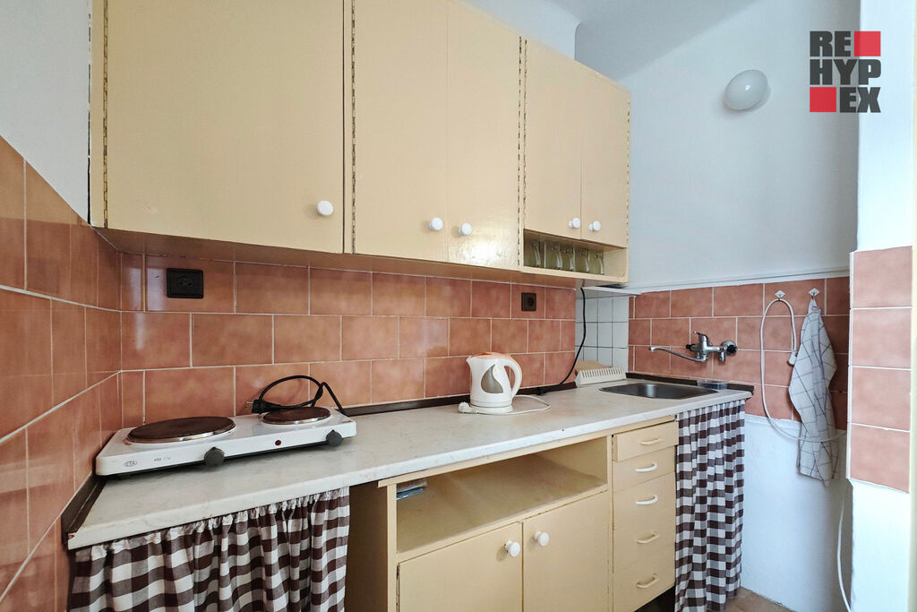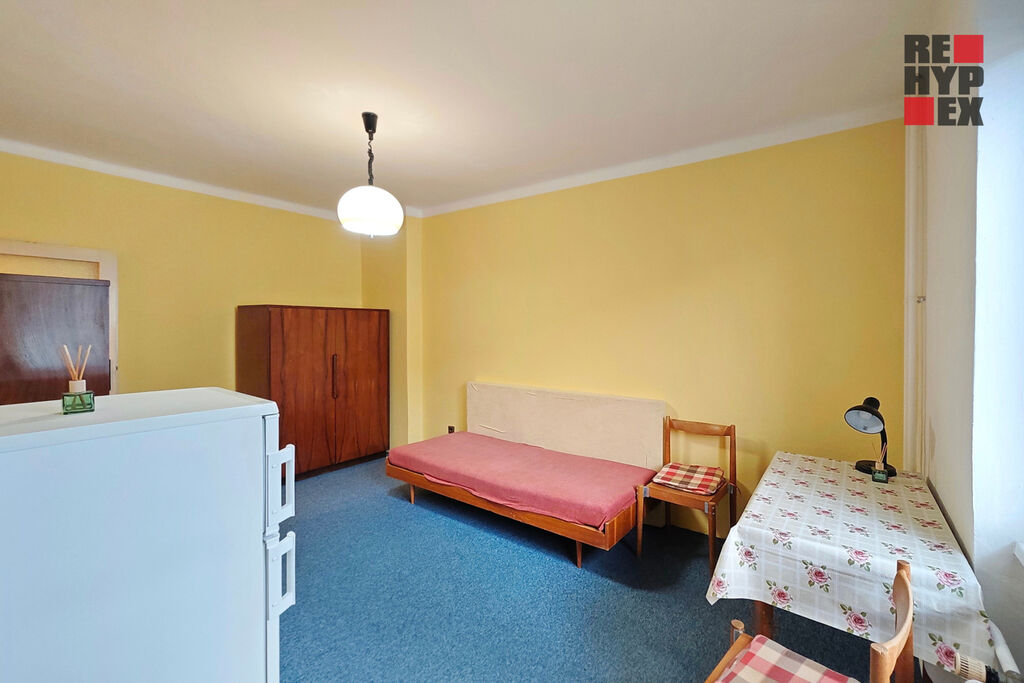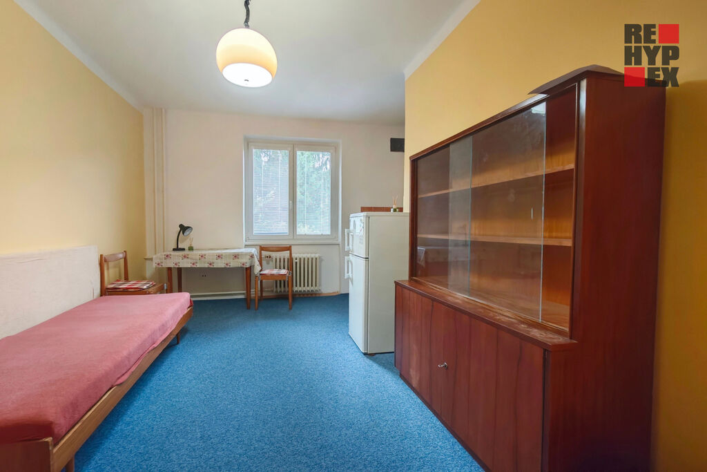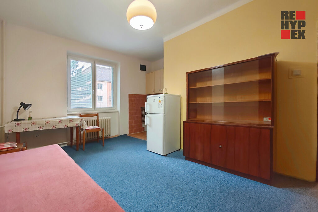 Nabízíme k pronájmu útulný byt 1+kk o celkové ploše 27,6 m² v cihlovém domě na sídlišti nedaleko městského centra. Byt se nachází v 1NP a je v dobrém stavu. Vytápění je zajištěno ústředním dálkovým topením. Je vybavený starší kuchyňskou linkou, elektrickým vařičem, rychlovarnou konvicí, mikrovlnnou troubou, lednicí s mrazákem a stolem s dvěma židlemi. Dále koupelnou se sprchovým koutem, WC a místem pro připojení automatické pračky. V bytě je možnost připojení na internet pomocí pevného nebo optického kabelu. K bytu náleží také sklepní kóje.