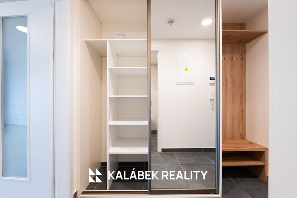 Dispozice bytu tvoří obývací prostor s plně vybavenou kuchyňskou linkou HANÁK (indukční deska, trouba, mikrovlnná trouba, lednice s mrazákem, myčka), koupelna se sprchovým koutem a WC, a vstupní chodba s vestavěnou skříní na míru. Z obytné části je vstup na lodžii orientovanou na východ. Byt je vybaven systémem řízeného větrání s rekuperací tepla. Dále je součástí standardu zabezpečovací systém Jablotron. Energetická třída B.