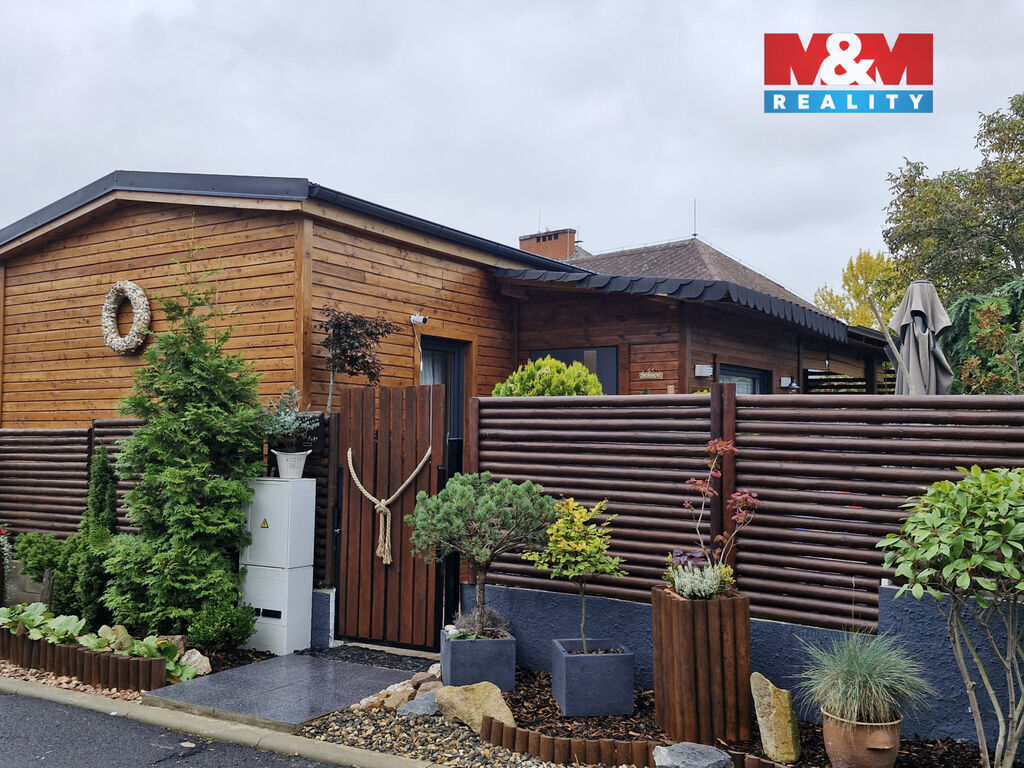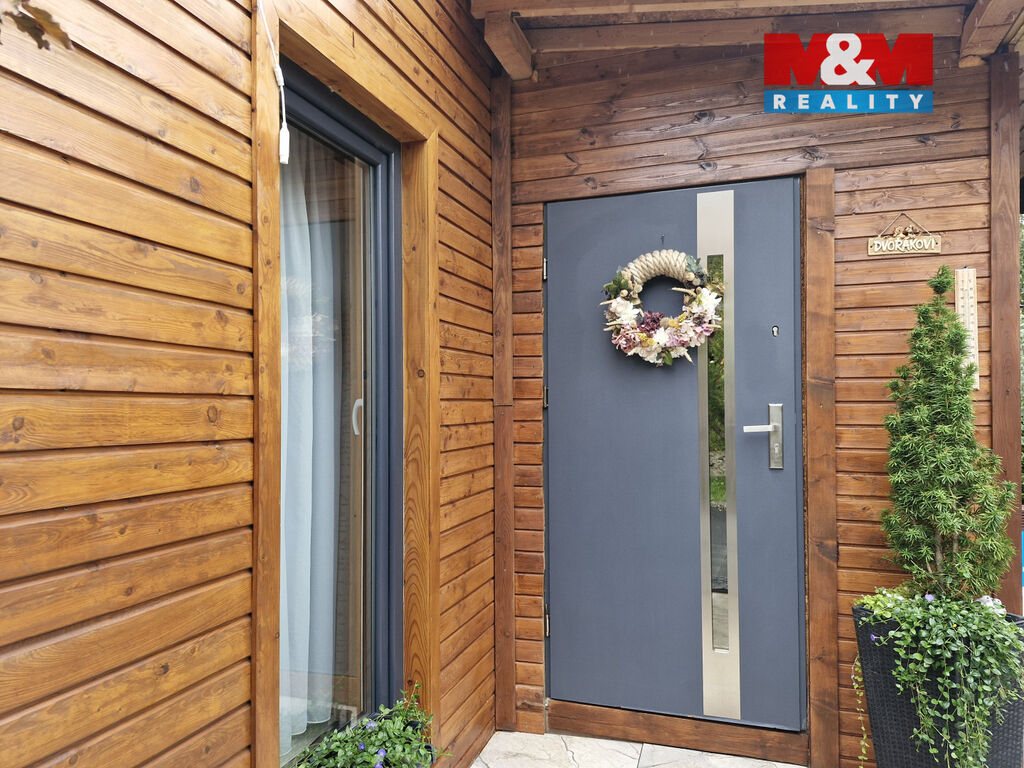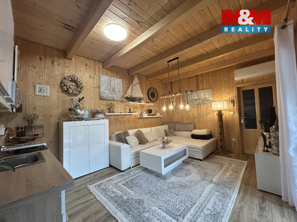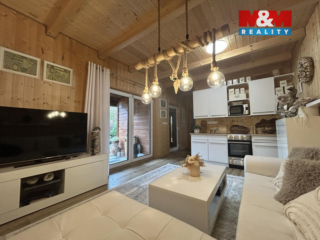 Domek je uložen na betonových patkách na pozemku o velikosti 128 m2. Základem dřevostavby je ocelová konstrukce, 30 cm stříkaná izolace a dřevěné obložení. Uvnitř domku přiznané trámy, podlaha dřevěná s linem. Na střeše pozinkovaný plech. Lze obývat celoročně. Jsou zde zavedeny všechny přípojky kanalizace, elektřina i vodovod. Dům disponuje kuchyní spojenou s obývacím pokojem, ložnicí, malým pokojem a koupelnou se sprchovým koutem a toaletou. Ohřev teplé vody zajišťuje bojler , vytápění v každé místnosti zajištěno klimatizací. Vstup z verandy, nebo přes předsíň. V létě poskytuje příjemný stín kryté posezení na verandě domku, k ochlazení je zde malý bazének a příjemný je jistě pohled na pečlivě udržovanou okrasnou zahrádku.
