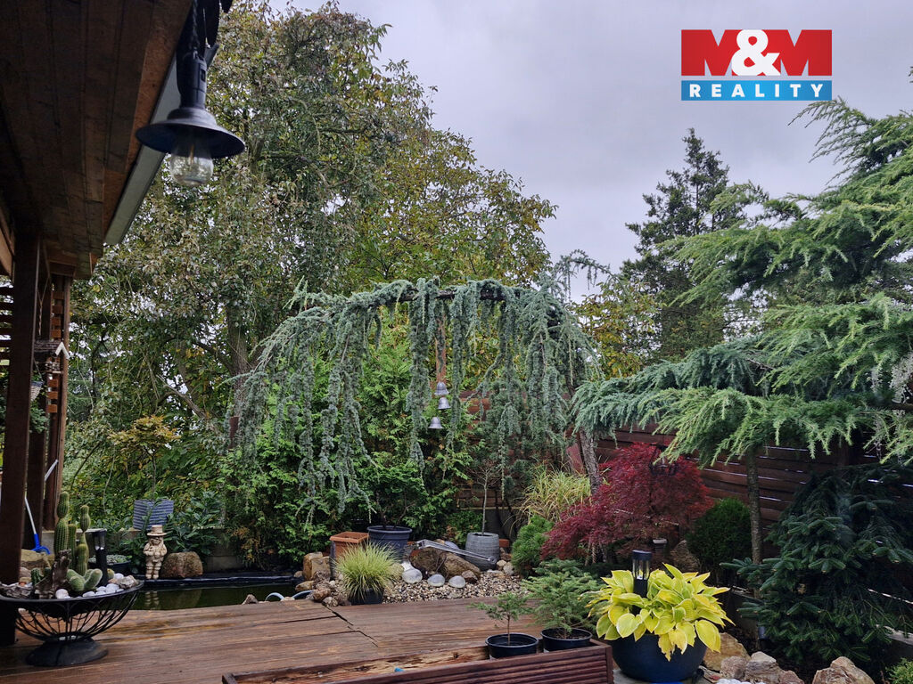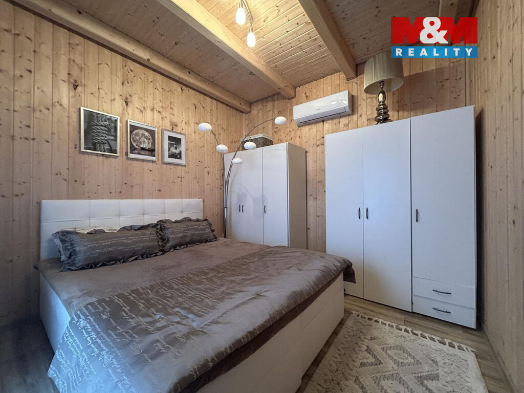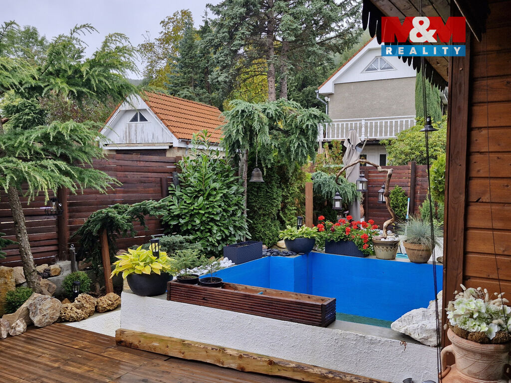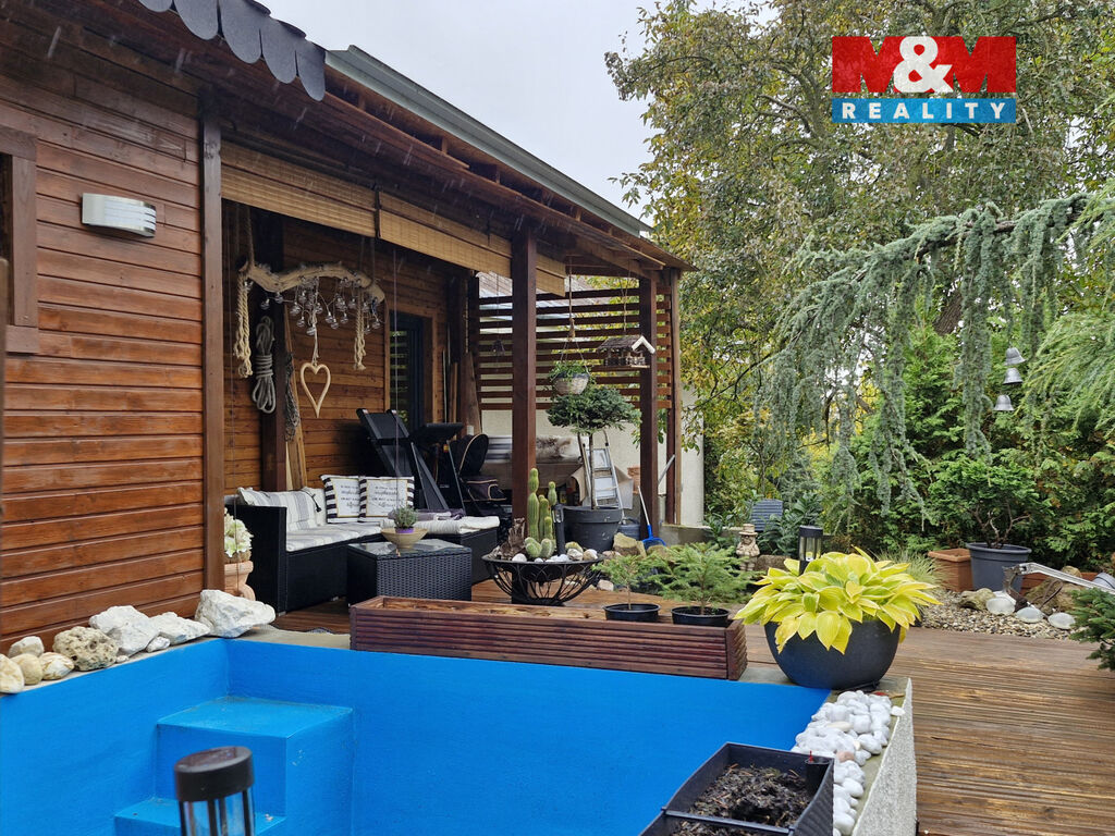 Domek je uložen na betonových patkách na pozemku o velikosti 128 m2. Základem dřevostavby je ocelová konstrukce, 30 cm stříkaná izolace a dřevěné obložení. Uvnitř domku přiznané trámy, podlaha dřevěná s linem. Na střeše pozinkovaný plech. Lze obývat celoročně. Jsou zde zavedeny všechny přípojky kanalizace, elektřina i vodovod. Dům disponuje kuchyní spojenou s obývacím pokojem, ložnicí, malým pokojem a koupelnou se sprchovým koutem a toaletou. Ohřev teplé vody zajišťuje bojler , vytápění v každé místnosti zajištěno klimatizací. Vstup z verandy, nebo přes předsíň. V létě poskytuje příjemný stín kryté posezení na verandě domku, k ochlazení je zde malý bazének a příjemný je jistě pohled na pečlivě udržovanou okrasnou zahrádku.