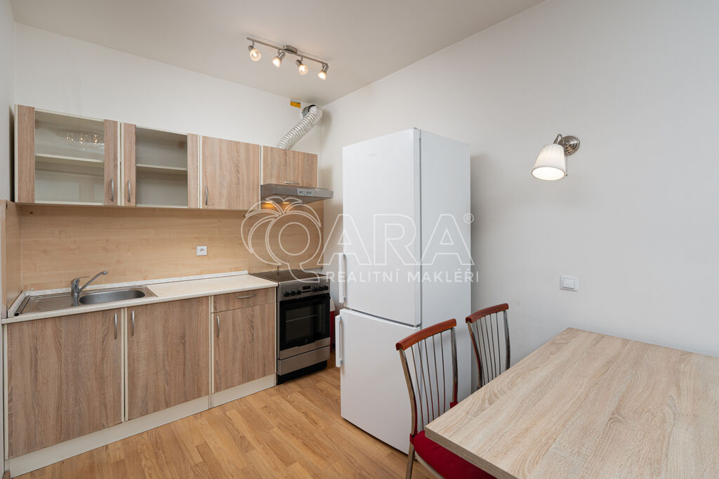 Byt je vybaven kuchyňskou linkou, sporákem s troubou, digestoří, lednicí s mrazákem, jídelním stolem se židlemi, pohovkou a úložnými skříňkami.