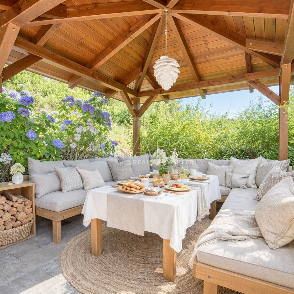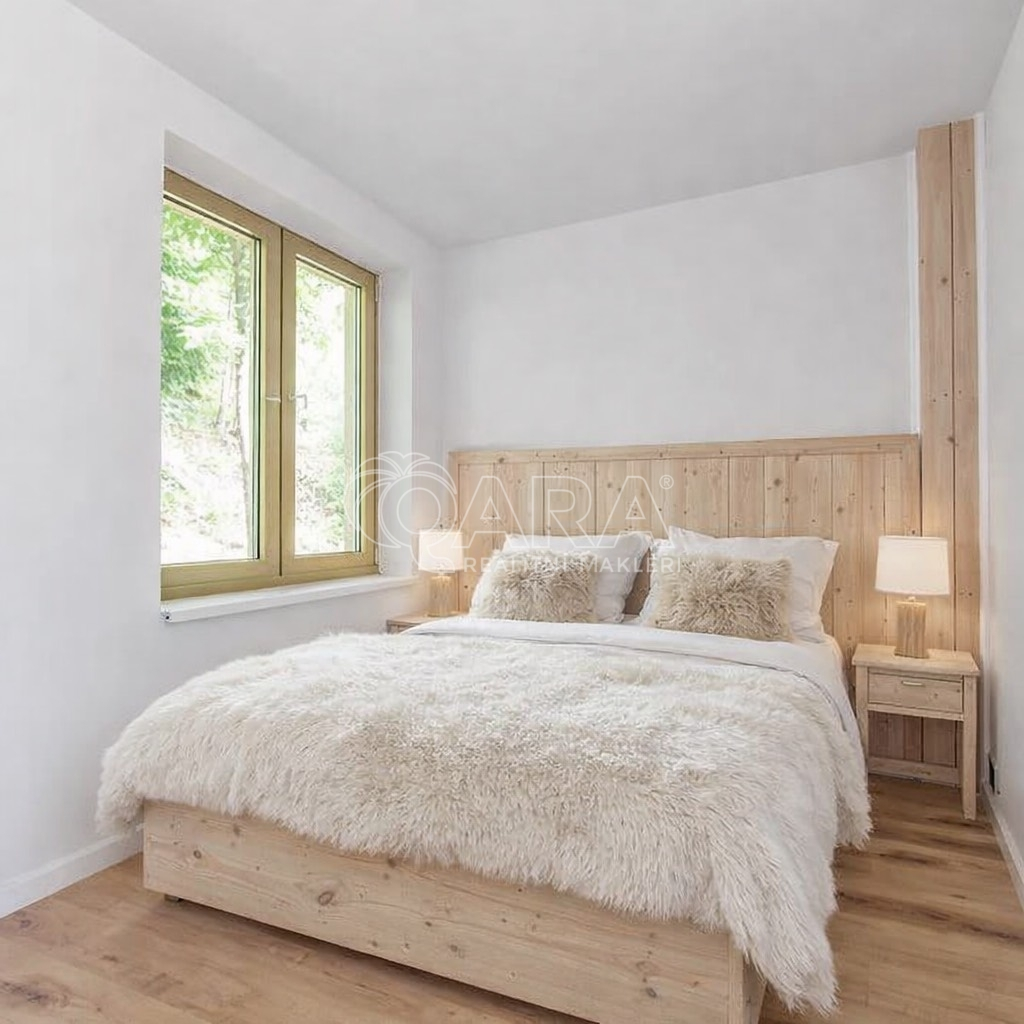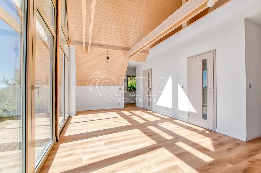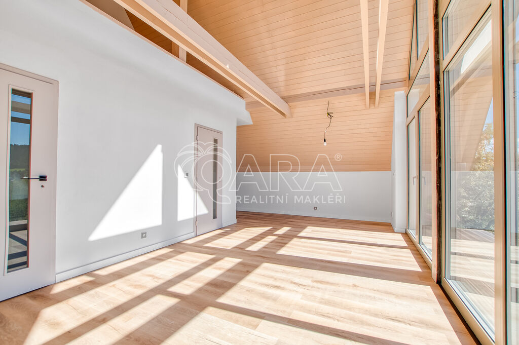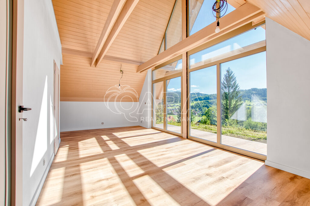 Dominantou je velkoformátové prosklení, které se táhne od podlahy až ke stropu a otevírá fascinující výhledy do okolní krajiny. Tento jedinečný architektonický prvek nejenže zaplaví interiér přirozeným světlem, ale zároveň vám poskytne přímý vstup na terasu, která se stane dokonalým místem pro odpočinek a pozorování přírody. Celkový design dokonale vybízí k vybavení v skandinávském stylu, který pracuje se světlými barvami a přírodními materiály.