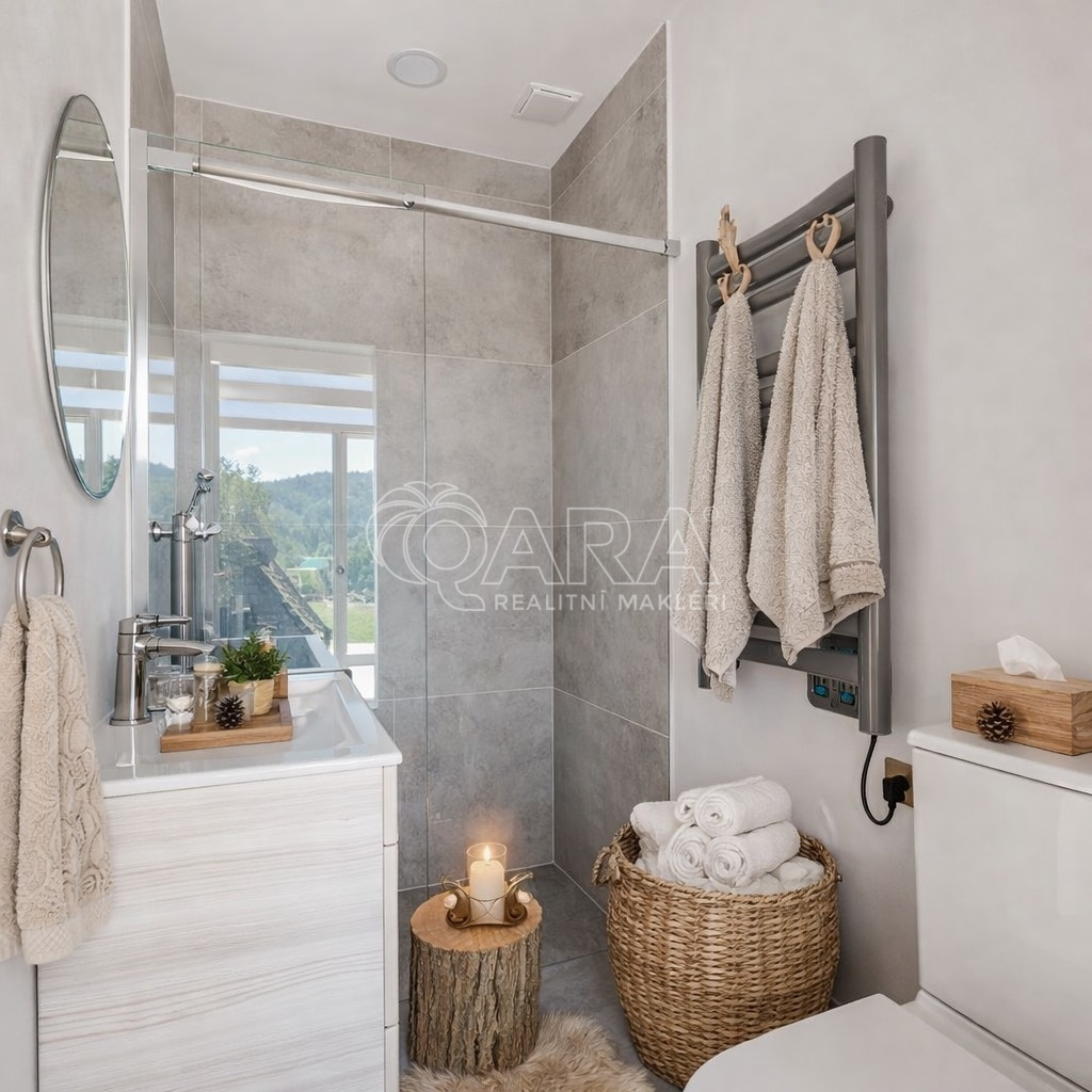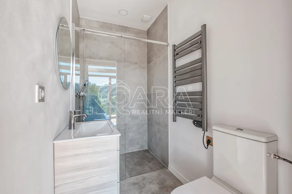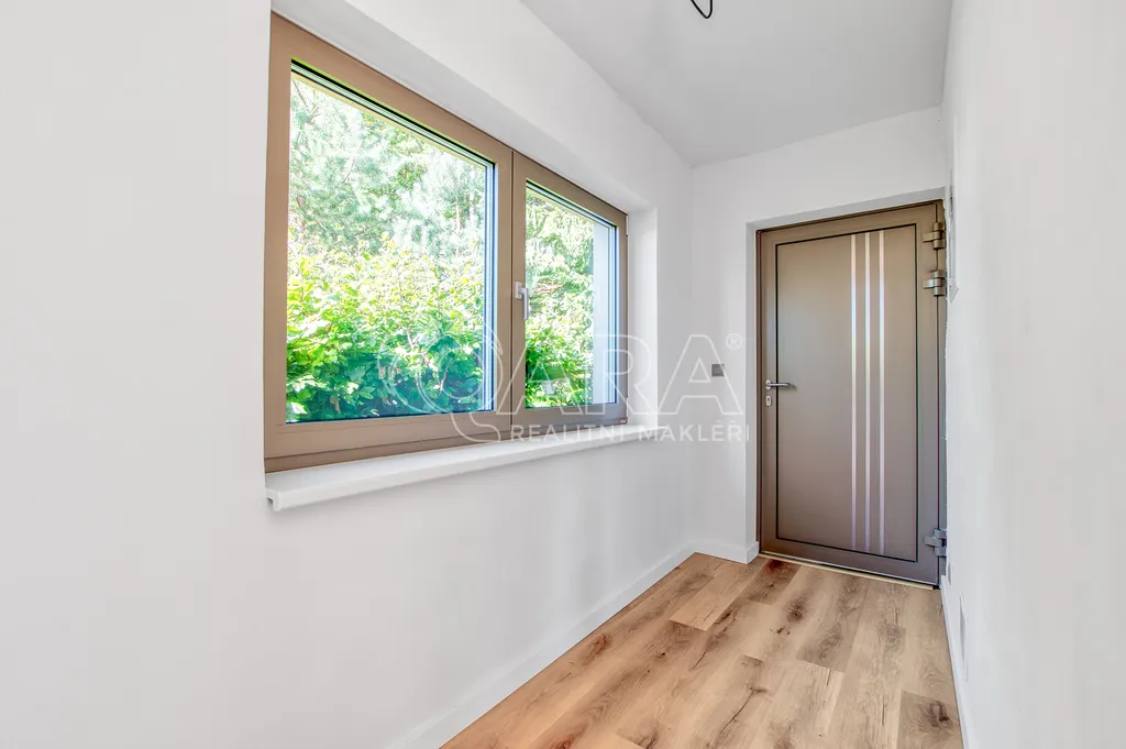 Objekt je osazen kvalitními hliníkovými okny s trojskly a speciální barevnou úpravou. Tato okna zajišťují vynikající tepelné i zvukové izolační vlastnosti a úsporu energií. Prostory podtrhují moderní podlahové krytiny – vinylová podlaha a dlažba, které jsou nejen elegantní, ale také velmi praktické a snadné na údržbu. O stálé a příjemné teplo se postará chytré podlahové vytápění, které si pohodlně nastavíte pomocí termostatu. Odpadní vody jsou řešeny vlastní jímkou, a k dlouhé životnosti a efektivitě přispívá i plechová střecha se stříkanou izolací.