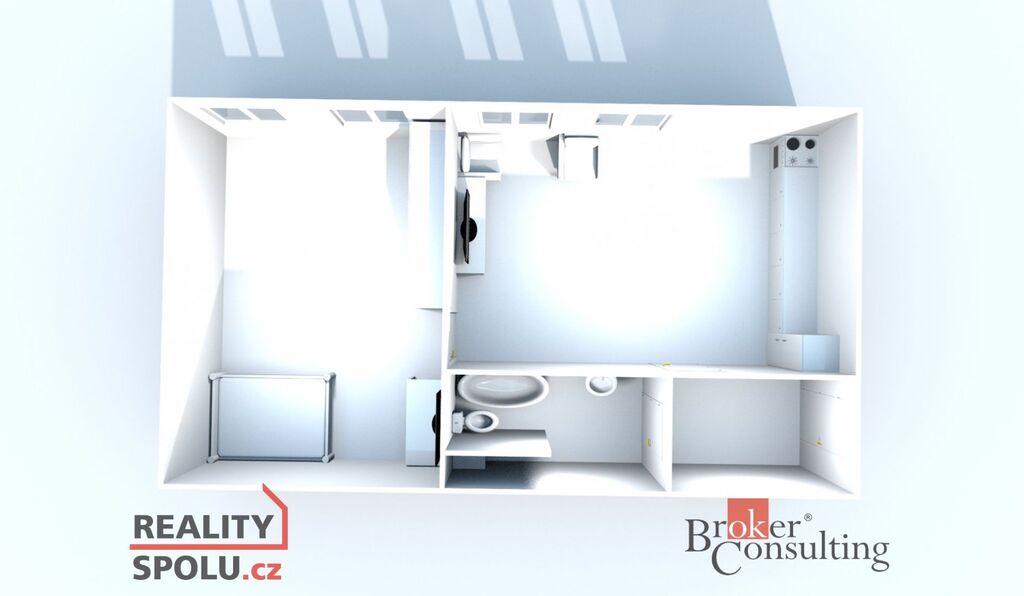 Byt se skládá z chodby, kuchyně spojené s obývací částí a ložnice. Samozřejmostí je koupelna s vanou a toaletou. Součástí bytu je menší přístavba alá mezonet, která může sloužit ke spaní nebo jako úložný prostor.