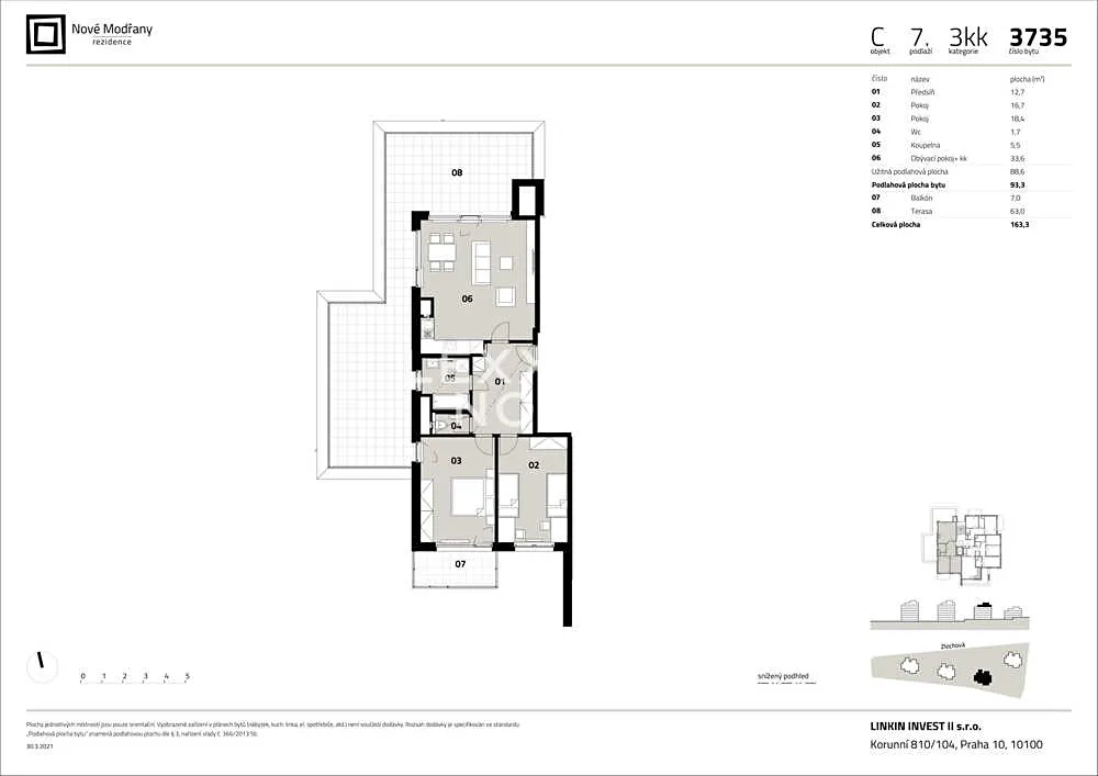 Nové Modřany jsou unikátní projekt, který v sobě spojuje komfort velkoměsta a svobodu přírody. Nadstandardní byt 3+kk o velikosti 93,2 m² vás okouzlí balkónem, který developer zvětšil, aby byt propojil s okolní zelení. Součástí projektu Nové Modřany je venkovní posilovna, kavárna, 3 dětská hřiště s trampolínami a na východní straně vyrůstá park. V projektu také najdete kočárkárnu, stojany na koloběžky a elektrické nabíječky na auta.