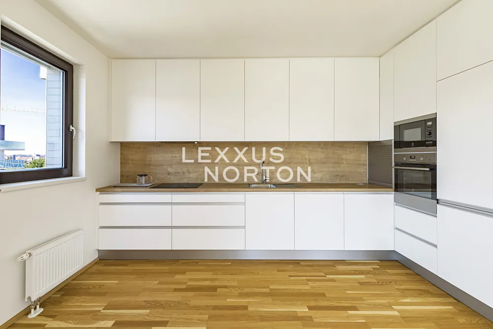 Tento moderní byt v domě s výtahem disponuje vstupní chodbou, prostorným obývacím pokojem s plně vybaveným kuchyňským koutem (troubou, lednicí, mrazákem, myčkou nádobí, mikrovlnnou troubou, sklokeramickou deskou, digestoří) a jídelním prostorem, ložnicí s vestavěnými skříněmi, komorou, koupelnou s umyvadlem, vanou a toaletou. V domě je zaveden bezpečnostní kamerový systém.