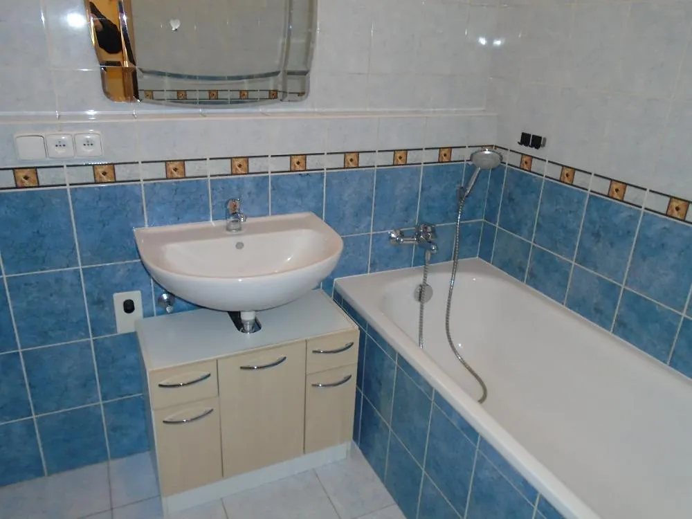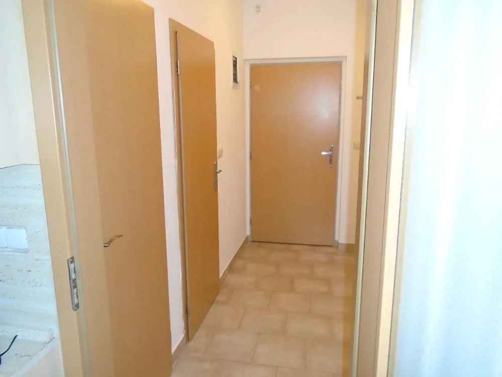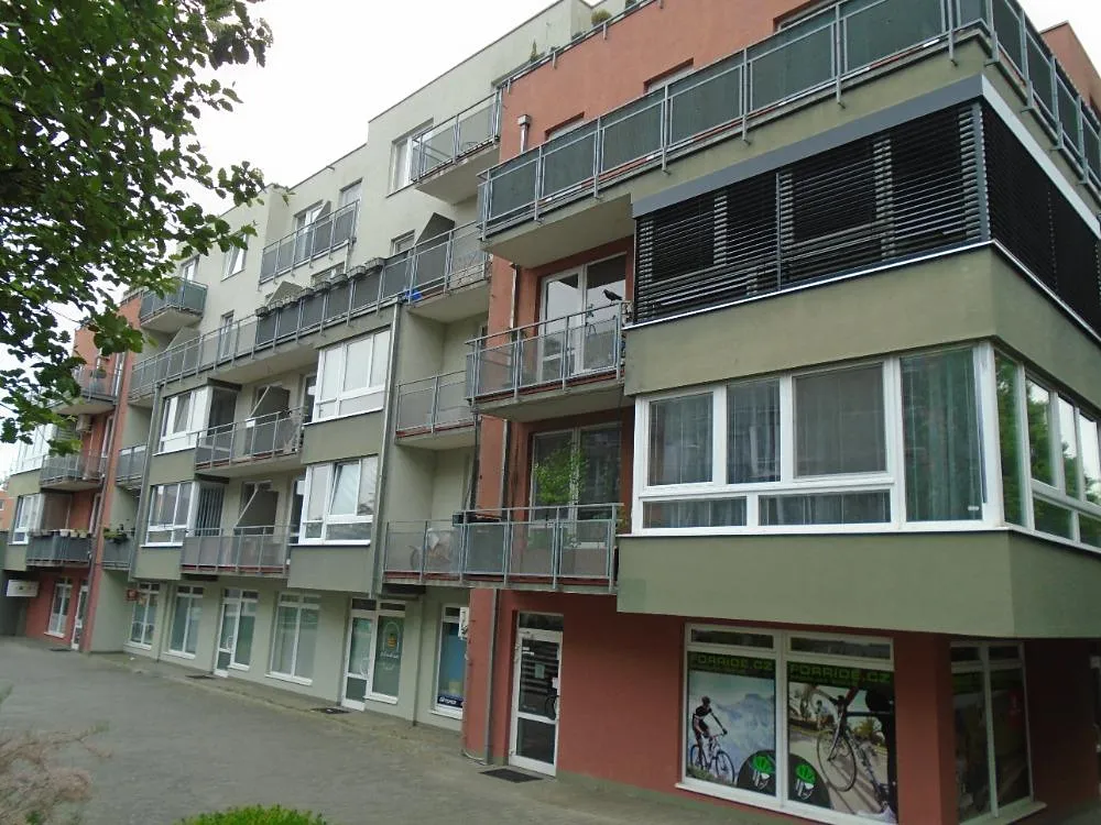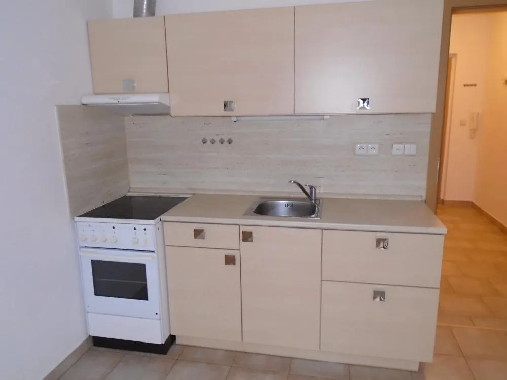 Byt se nachází ve druhém podlaží cihlového bytového domu s výtahem. V prostorné vstupní chodbě jsou dveře do koupelny s vanou a místem na pračku, samostatného WC a pokoje s kuchyňským koutem a vstupem na balkon.