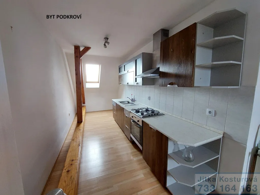 Ve 2 patře je podkrovní byt po rekonstrukci o vel. 3kk a výměře cca 66 m2. V celém bytě je položena laminátová podlaha, koupelna a WC je dlažba. Součástí je vstupní chodba, koupelna s umyvadlem, sprchovým koutem a WC ( samostatný plynový kotel), 2 samostatné pokoje, 1 pokoj s kuchyňským koutem a kuchyňskou linkou, klimatizace, k dispozici terasa v mezipatře.