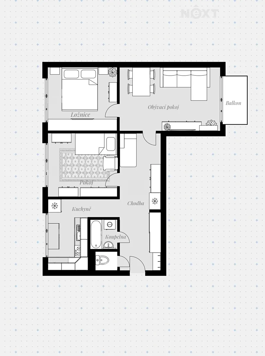 Díky své dispozici a dostatku denního světla působí byt velmi vzdušně a nabízí příjemné prostředí pro rodinné bydlení.