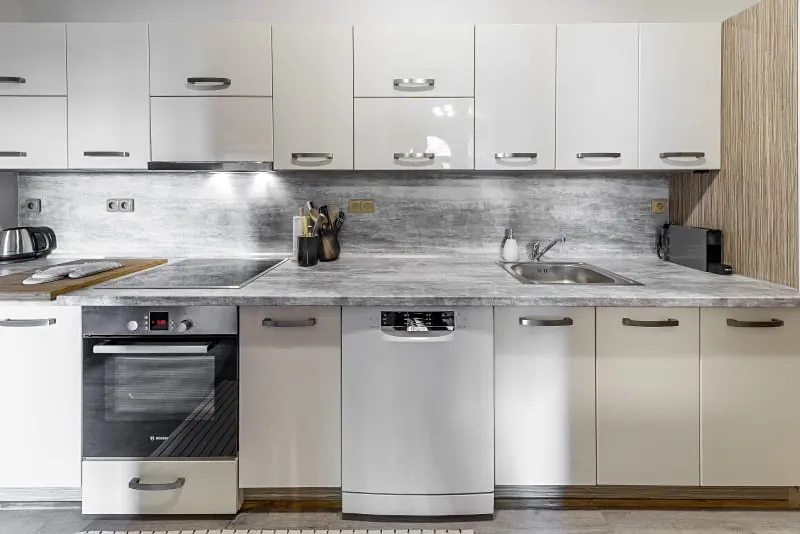Disponuje značkovými spotřebiči - elektrický sporák, myčka, pračka Bosch, lednice s mrazákem Electrolux.