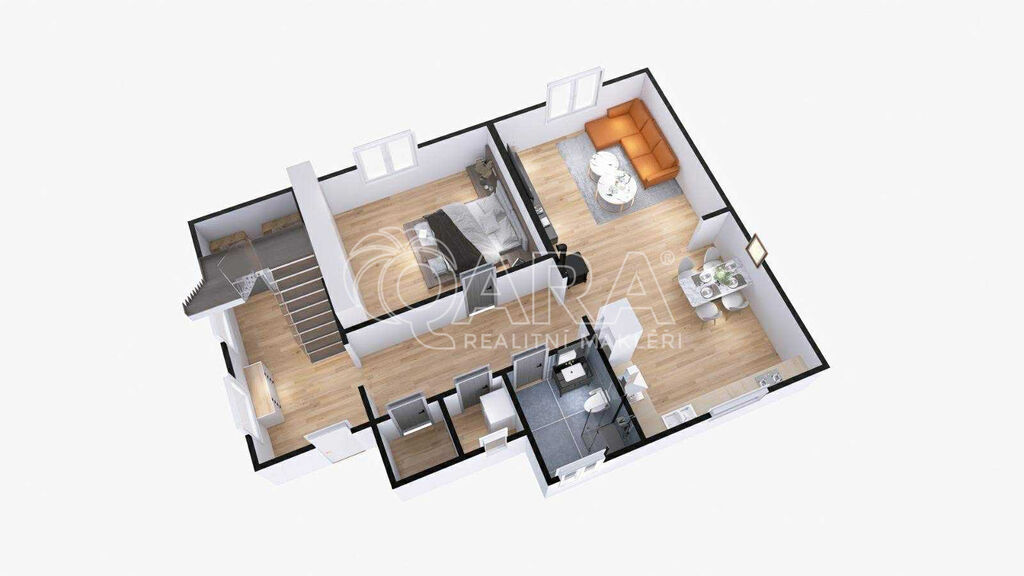 V patře (2. NP): Zde se nachází klidová zóna s velkou hlavní ložnicí, dětským pokojem, prostornou kanceláří a druhou, hlavní koupelnou.