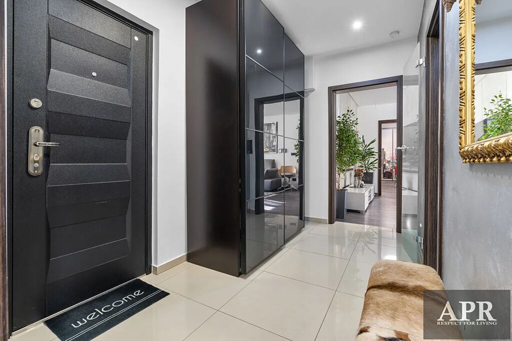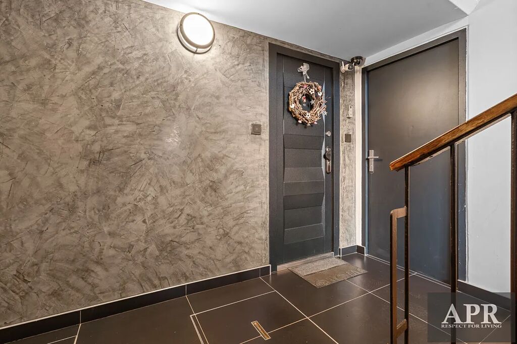 Celé to začíná na společné chodbě na patře při vstupu do bytu. Na zemi položená velkoformátová dlažba, čelní stěna u vstupních dveří Benátský štuk, nové vypínače a světlo. Bezpečnostní dveře navíc hlídá kamera s přípravou centrálního zabezpečení, dále videotelefon.