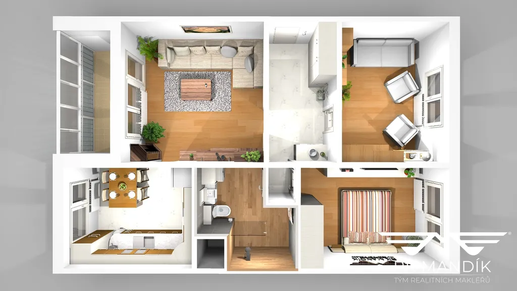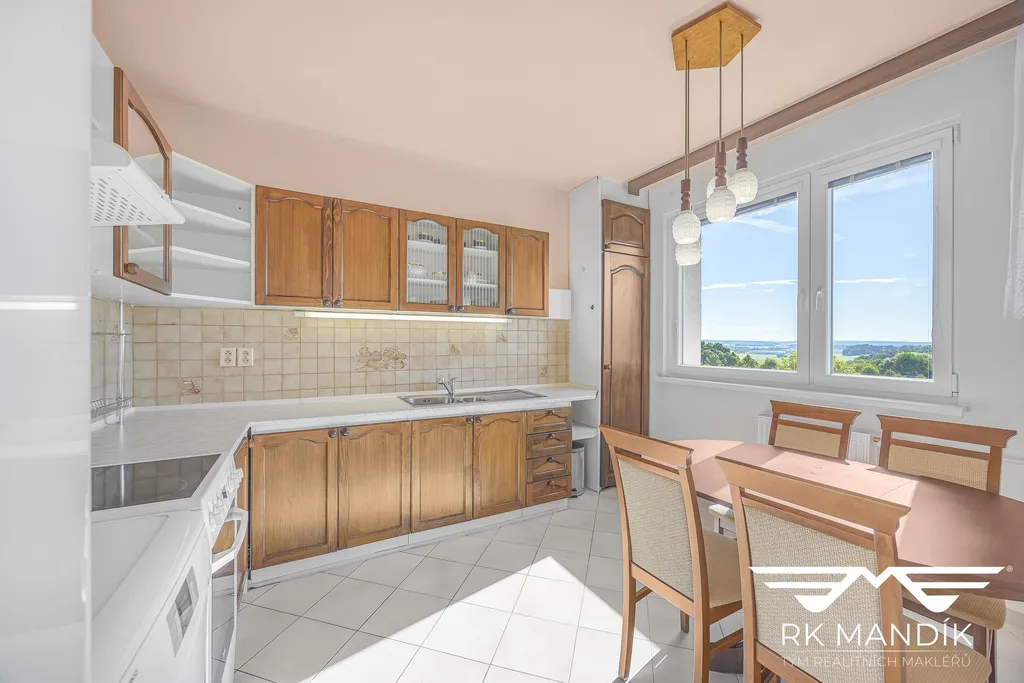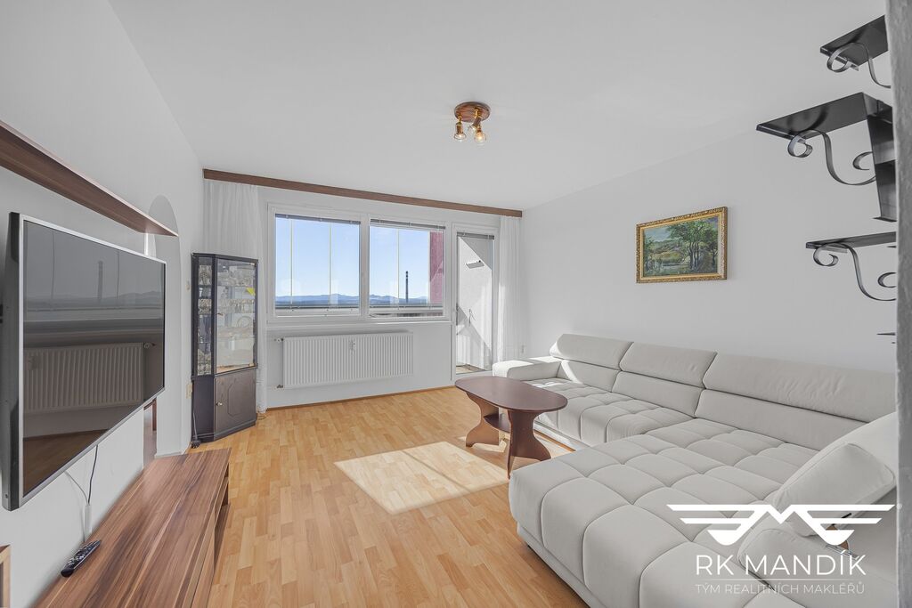 Dispozičně je byt řešen obývacím pokojem s lodžií, kuchyní s orientací na jižní stranu a překrásným výhledem.