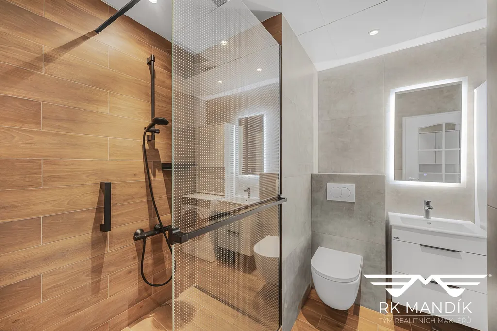 Dále se v bytě nachází ložnice a další pokoj s orientací na sever, koupelna se sprchovým koutem a WC.