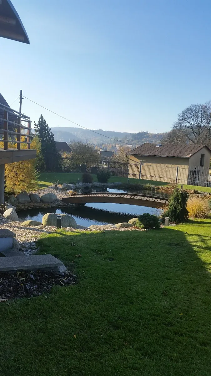 parapety žulové, dveře mahagonové, venkovní terasy z trvanlivého tvrdého dřeva bangkirai, krbová kamna, krb.