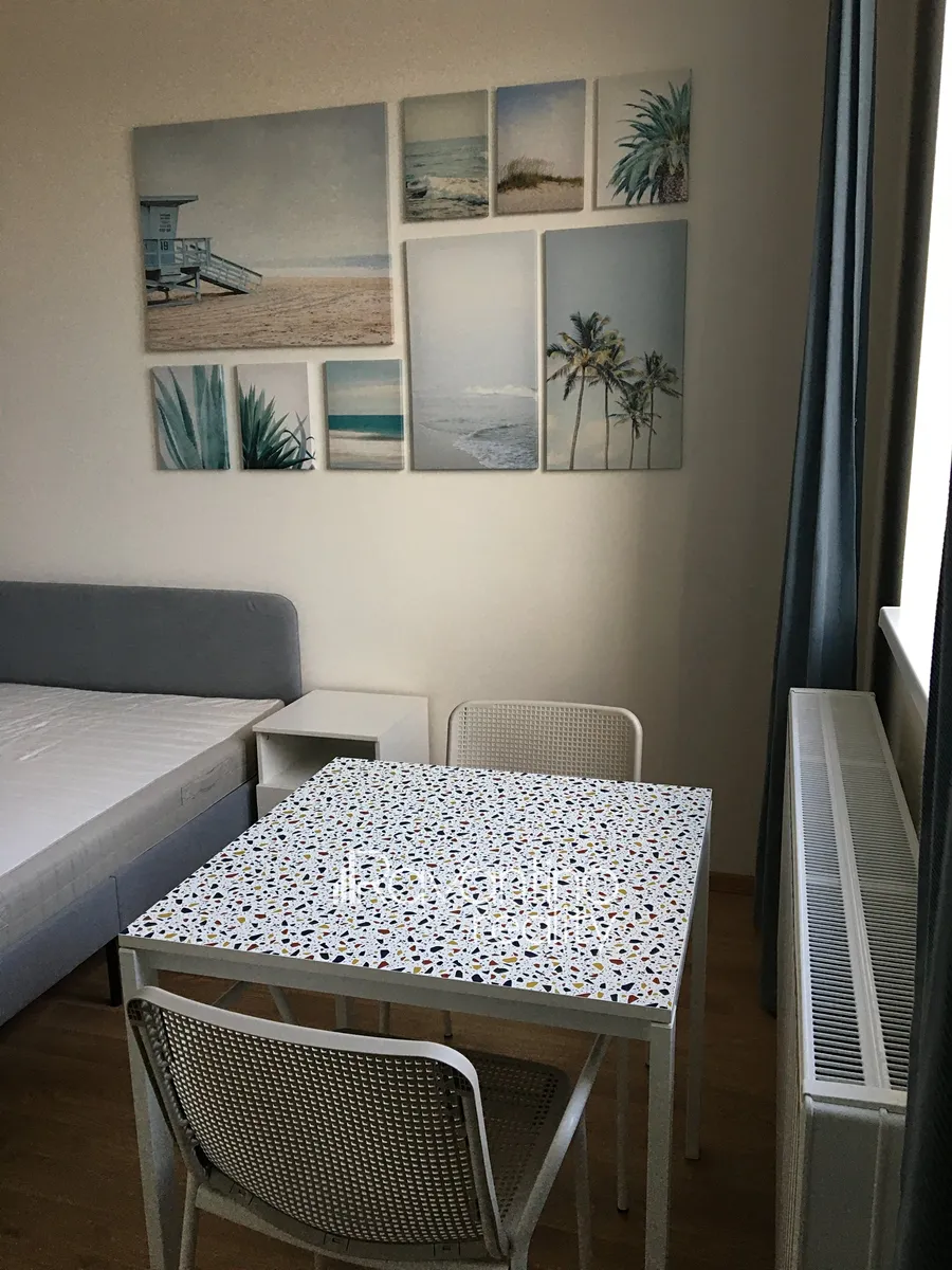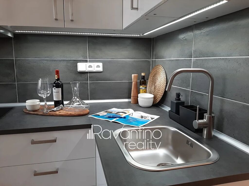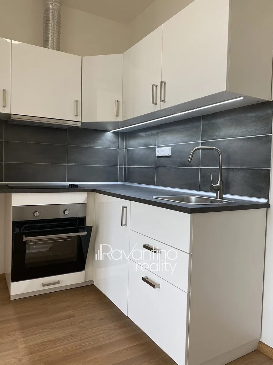 Světlá kuchyňská linka je plně vybavená varnou deskou a troubou, společně se stylovou koupelnou zajišťují velmi pohodlné a moderní bydlení. Byt je kompletně zařízený – najdete v něm vybavení, jako je pračka, lednička, postel, šatní skříň, křeslo, jídelní stůl se židlemi, TV stolek a lampa. Dispozice bytu: zádveří 1,8 m2, kuchyňský kout 6,6 m2, pokoj 17,8 m2, koupelna s WC 3,4 m2.