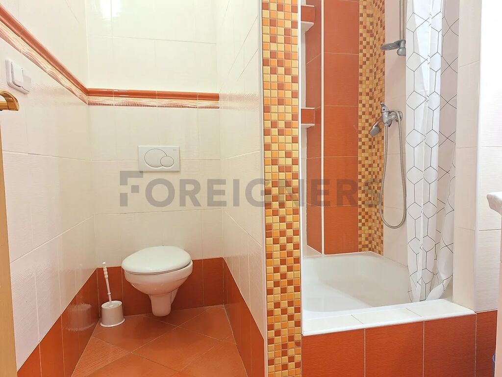 Koupelna se sprchou, pračkou a umyvadlem se zrcadlem; WC je oddělené.