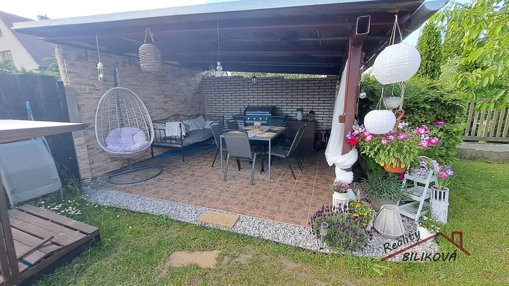 Na polovině zahrady plechová garáž, pergola na druhé polovině kůlna a terasa se vstupem do přízemí domu.