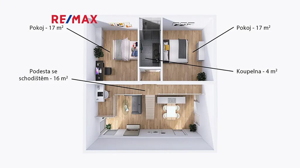 V patře na vás čekají další dva pokoje a multifunkční místnost, připravená buď jako prostorná šatna, nebo budoucí druhá koupelna – její možnou podobu si můžete prohlédnout ve vizualizaci ve fotogalerii.