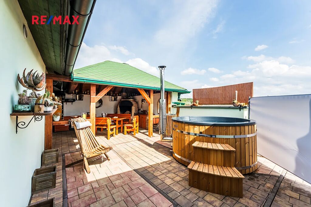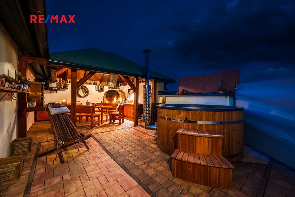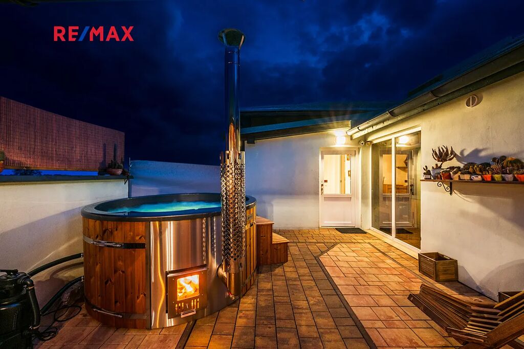 Dominantou prostoru je koupací sud z masivního dřeva s hydromasážním a aeromasážním systémem, LED osvětlením a dřevem vytápěným topením – perfektní místo pro relaxaci pod širým nebem. Celé zákoutí je dokonale ukryté před zraky okolí, takže si můžete užívat naprosté soukromí.