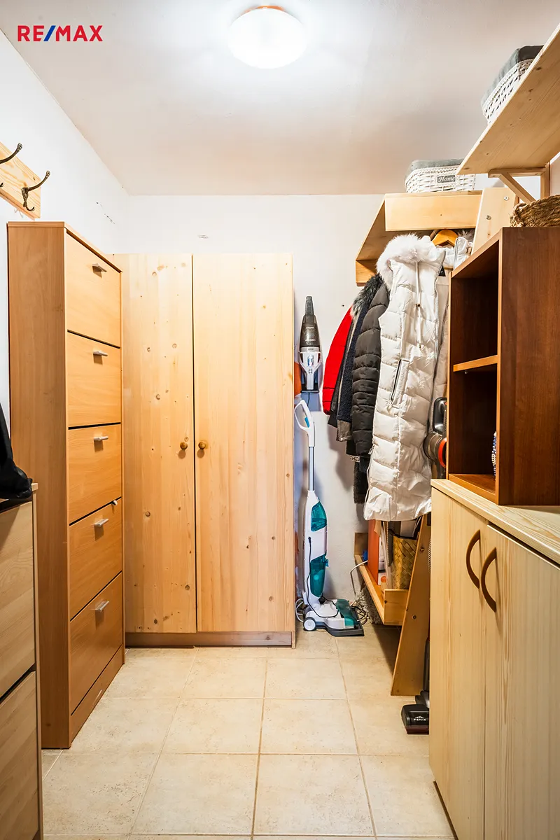 V přízemí dále naleznete komfortní ložnici, samostatnou šatnu, koupelnu vybavenou vanou i sprchovým koutem, toaletu, předsíň a praktické úložné prostory.