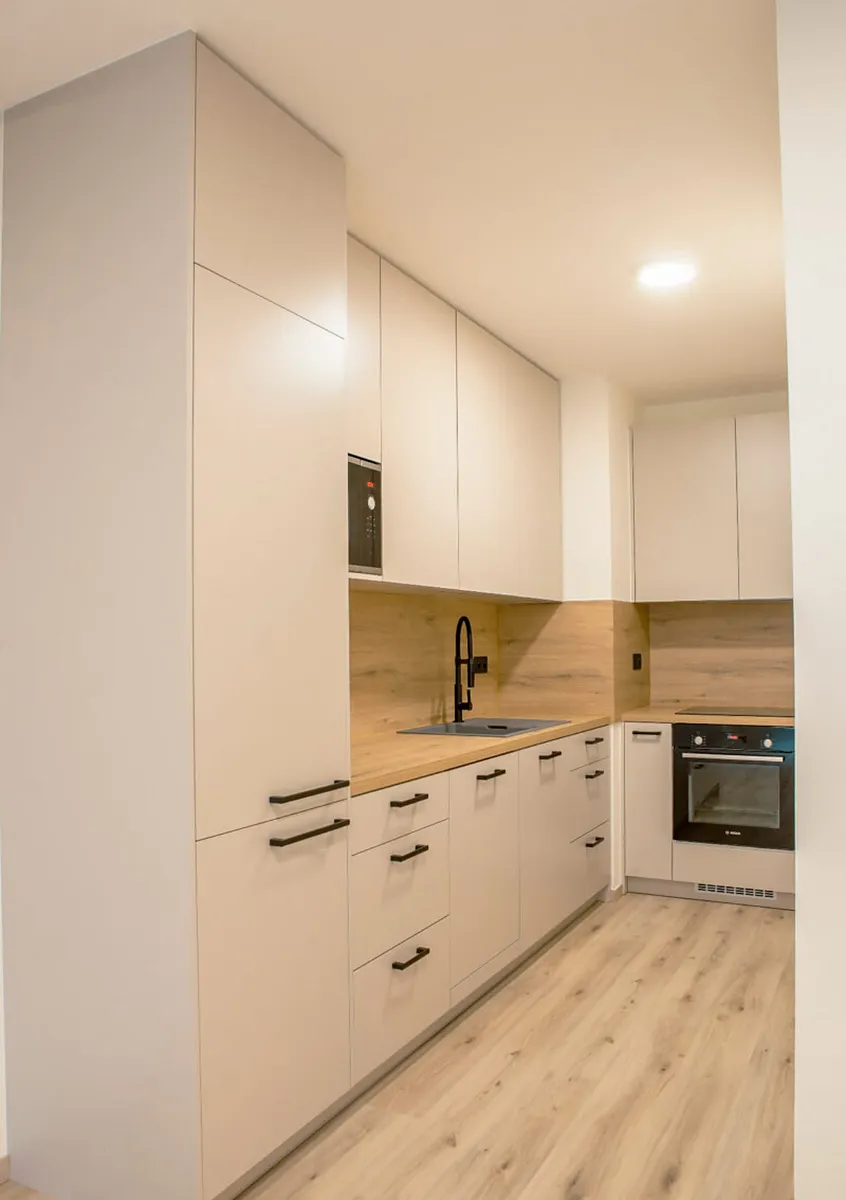 Byt se pronajímá nezařízený, k dispozici je nová moderní kuchyňská linka vybavená spotřebiči – lednicí, sporákem, troubou, mikrovlnnou troubou, myčkou a digestoří.