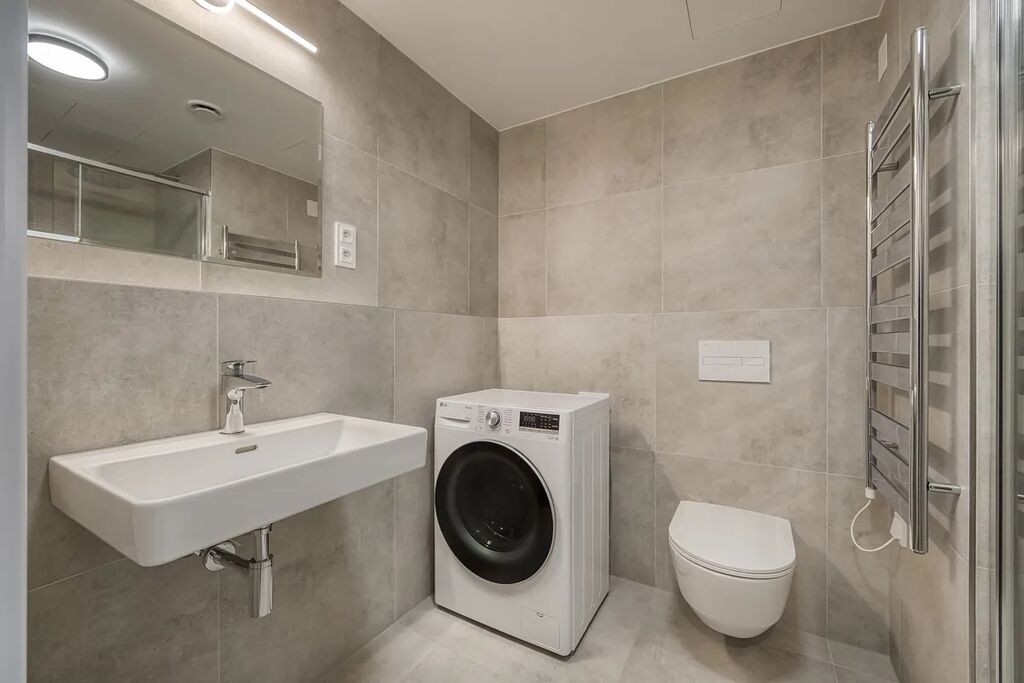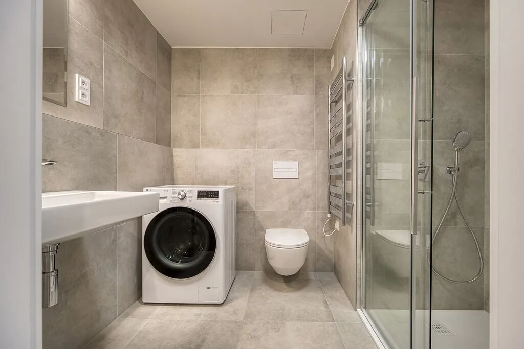 - Koupelna se sprchovým koutem a pračkou se sušičkou, předsíň s úložným prostorem.