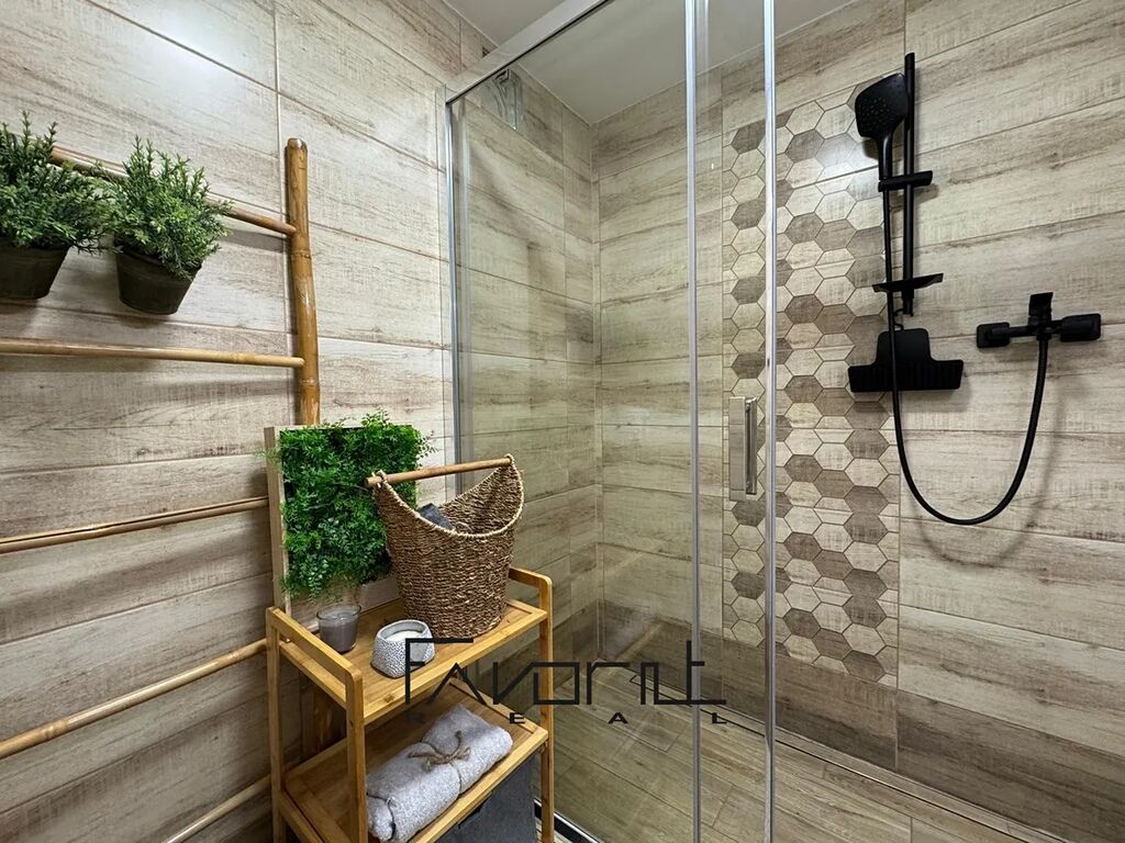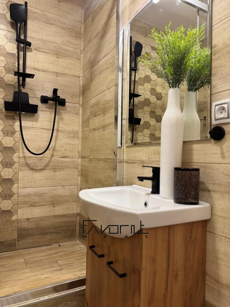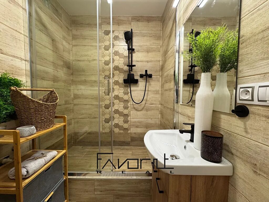 • Zděná koupelna s moderním sprchovým koutem, umyvadlem se skříňkou a přívodem na pračku