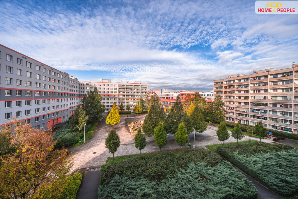 Z jedné strany bytu je příjemný výhled do klidného vnitrobloku, ve kterém se nachází malé náměstí s uměleckou instalací z kamene – několik kamenů rozmístěných vedle sebe vytváří zajímavý a odpočinkový prostor.