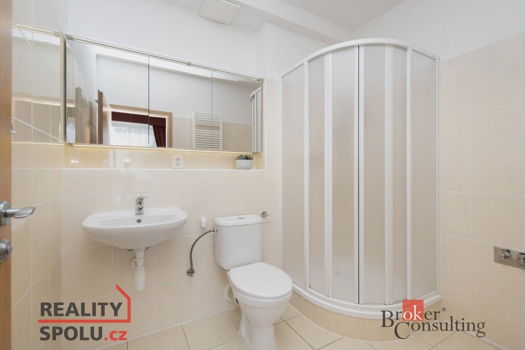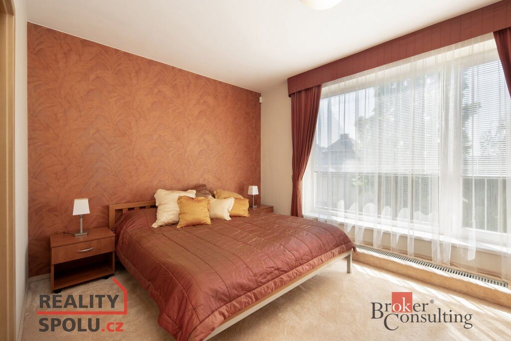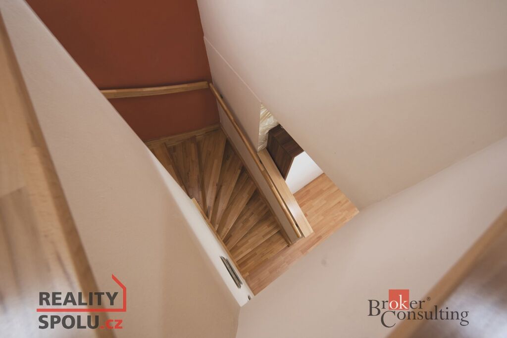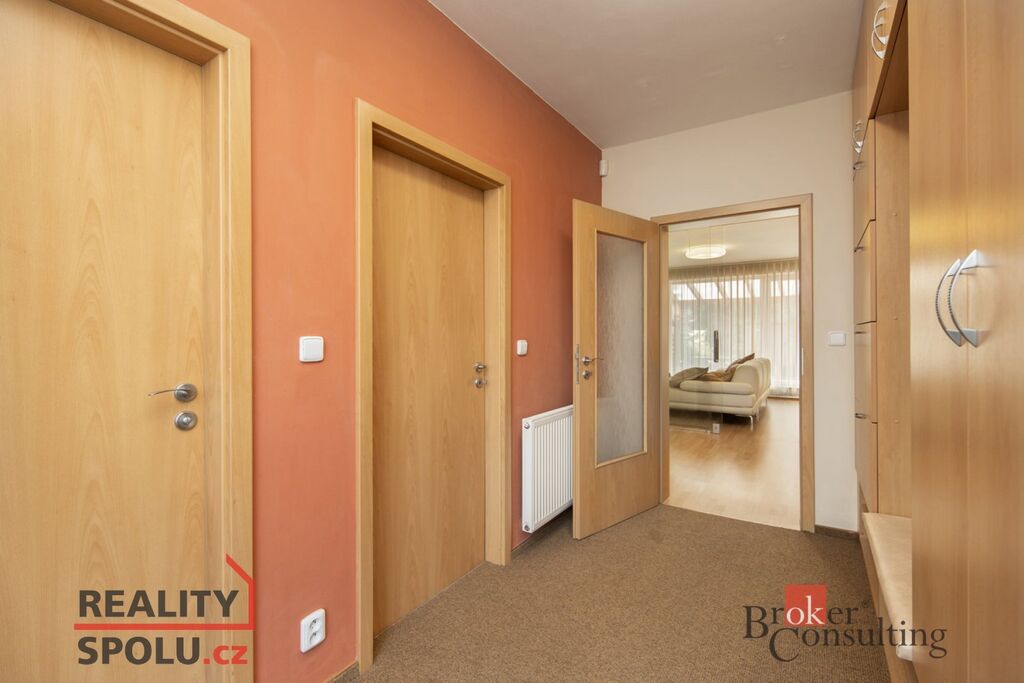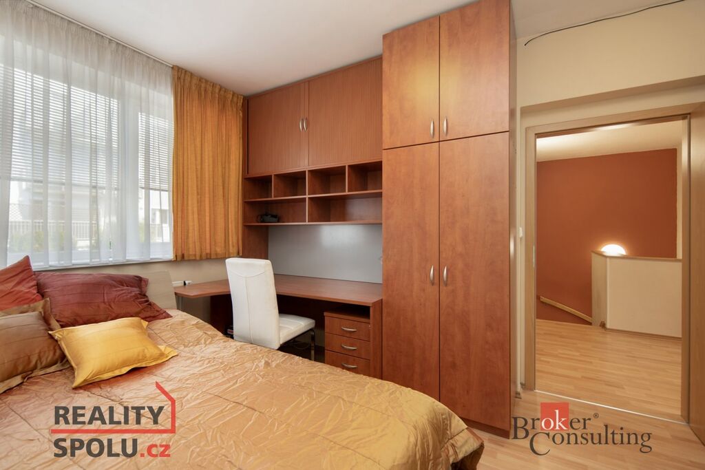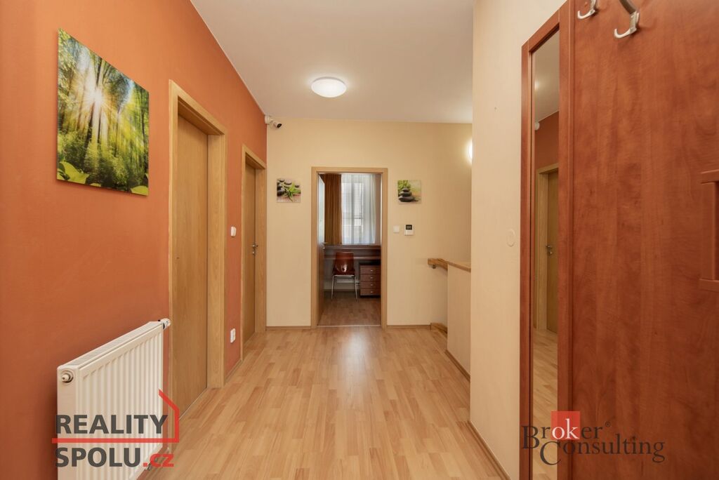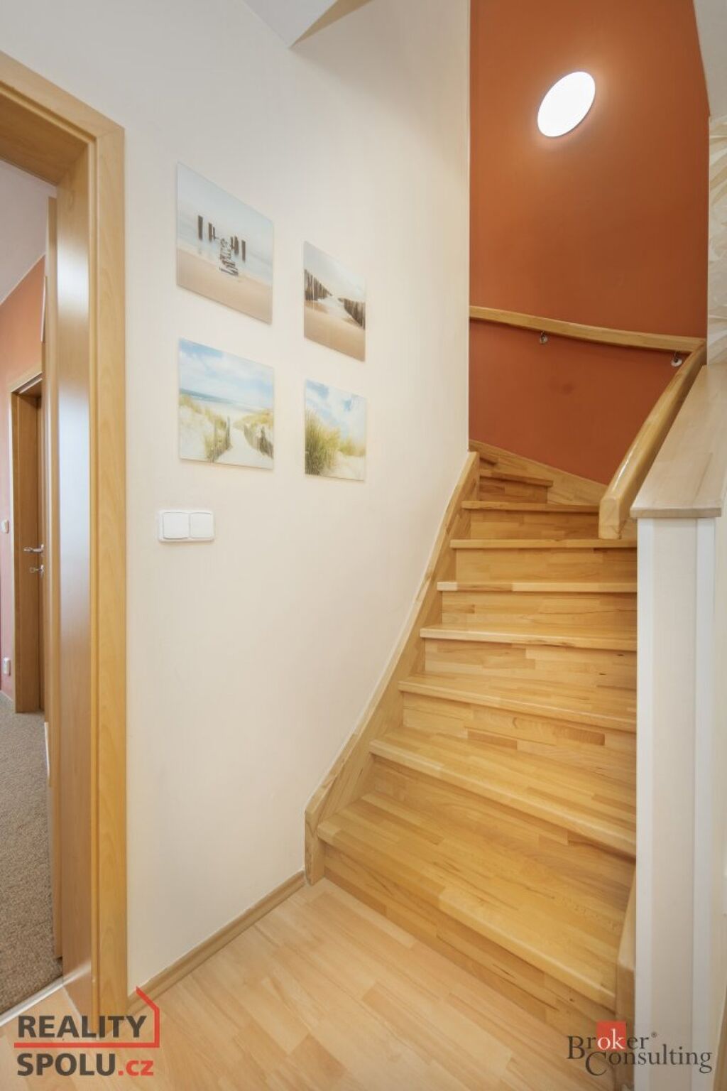 V horním patře se nachází ložnice, dětské pokoje a koupelny. Parkování je jedno v kryté zamykací garáži, druhé je před garáží venku na vlastním pozemku. Dům je vybaven EZS a kamerovým systémem. Půda nad domem je zateplená, obložená sádrokartónem, možno využít jako sklad nebo další šatnu.