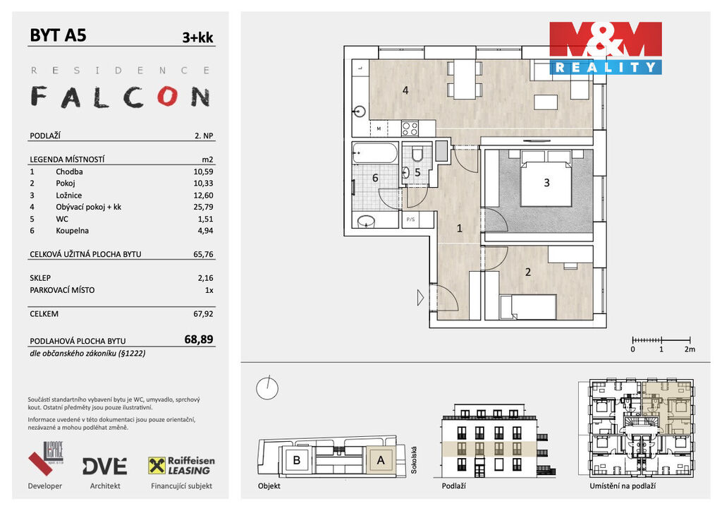 Byt se nachází ve 2. nadzemním podlaží a nabízí dispozici 3+kk o výměře 68,89 m². K jednotce náleží sklep o velikosti 2,16m² a parkovací stání. Klienti mají na výběr ze dvou vysokých standardů vybavení – Friendly a Gorgeous, zahrnujících velkoformátová okna, izolační trojskla a kvalitní materiály.