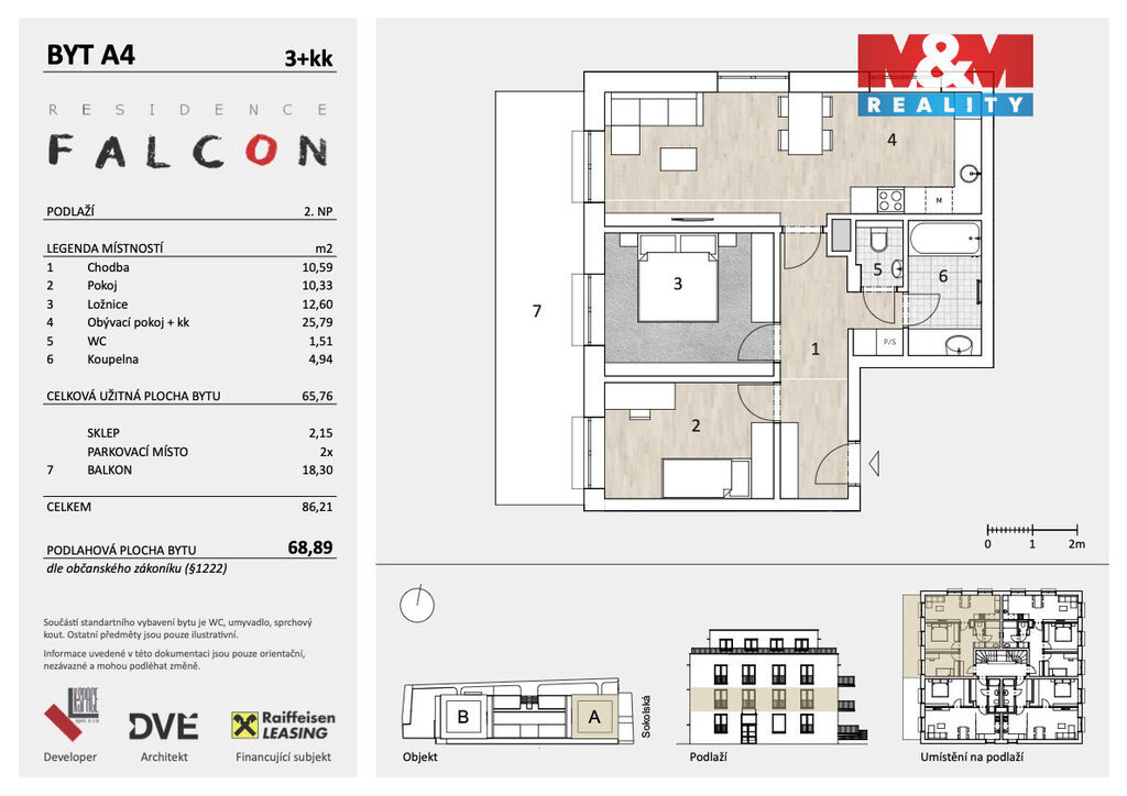 Byt se nachází ve 2. podlaží a nabízí dispozici 3+kk o výměře 68,89m². K jednotce náleží balkon 18,3m², sklep 2,15m² a dvě parkovací stání. Klienti mají na výběr ze dvou vysokých standardů vybavení – Friendly a Gorgeous, zahrnujících velkoformátová okna, izolační trojskla a kvalitní materiály.